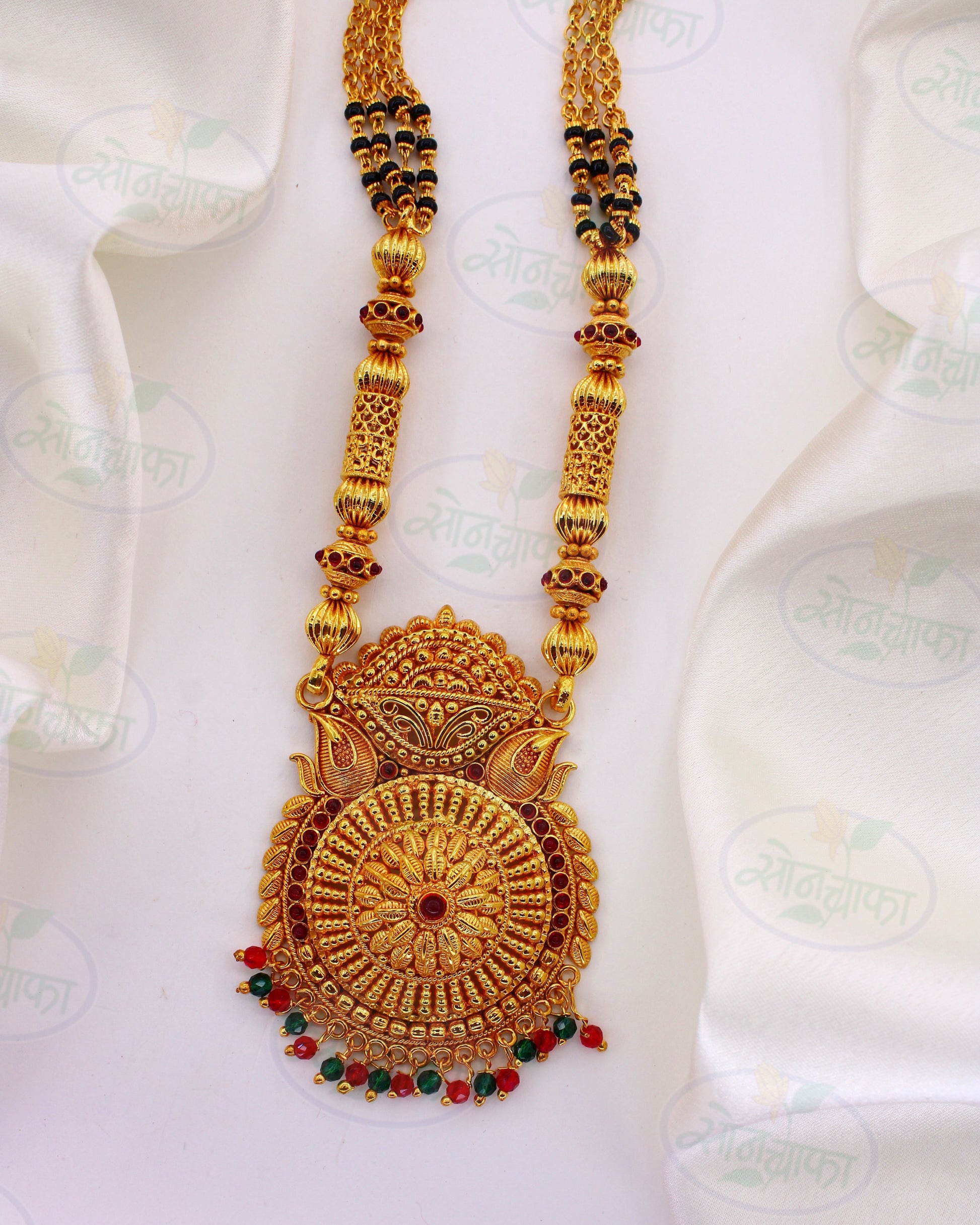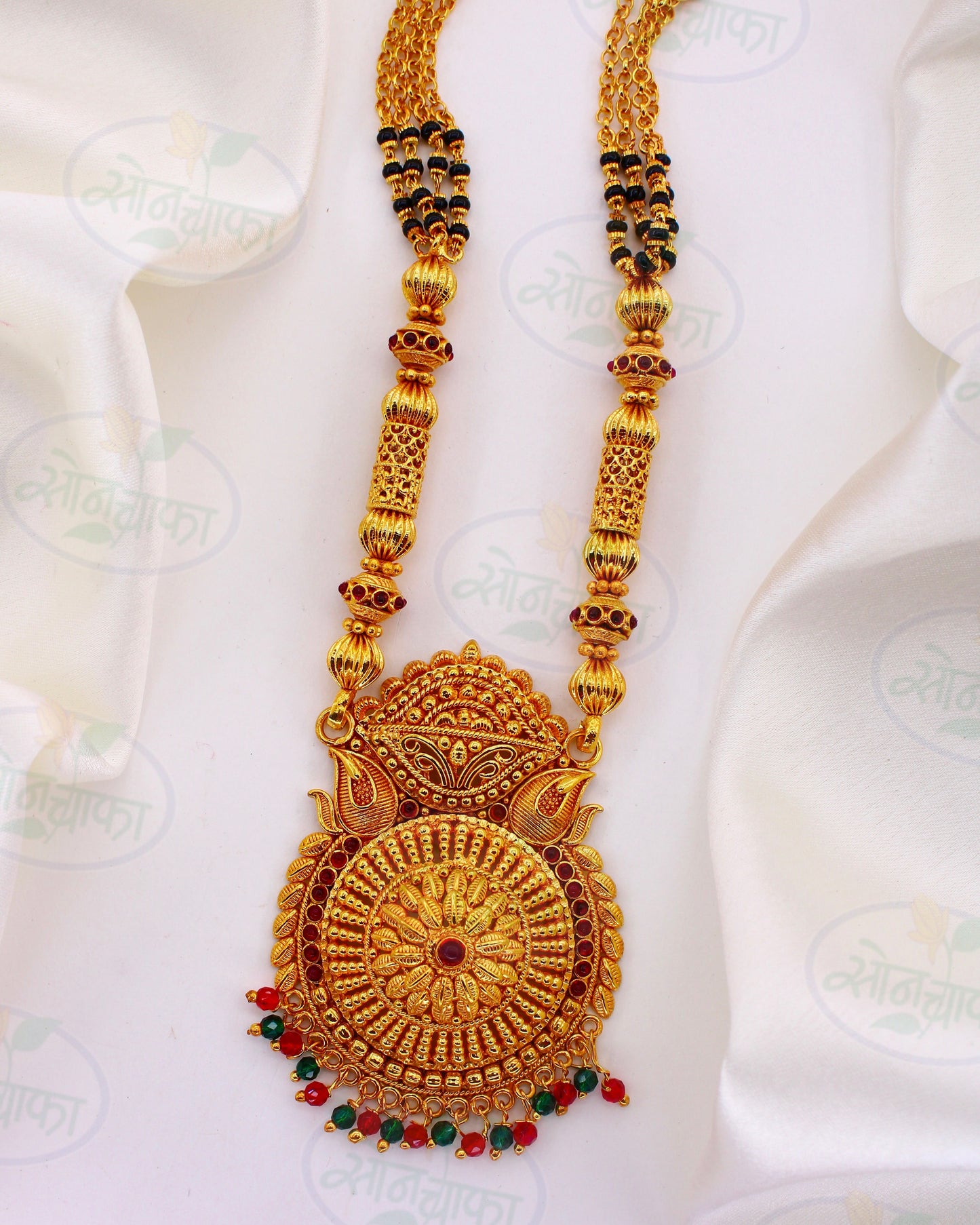 Sonchafa Jewellery brings this appealing mangalsutra for women who love to wear traditional jewellery. It is studded with shiny pink stones and fashioned from highly durable matte gold finish metal. The pendant feature attractive leaf with floral design on metal surface along with dangled golden beads.