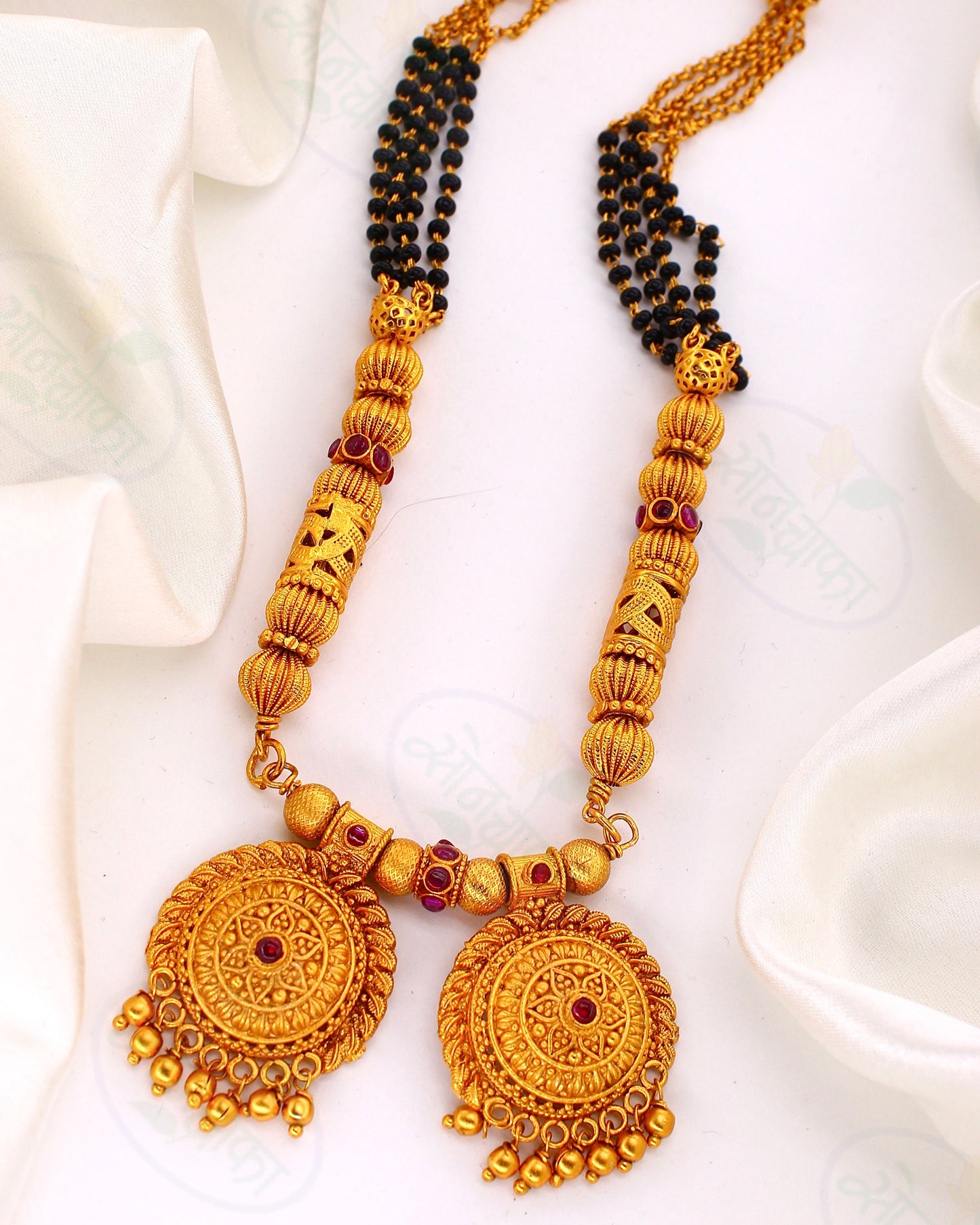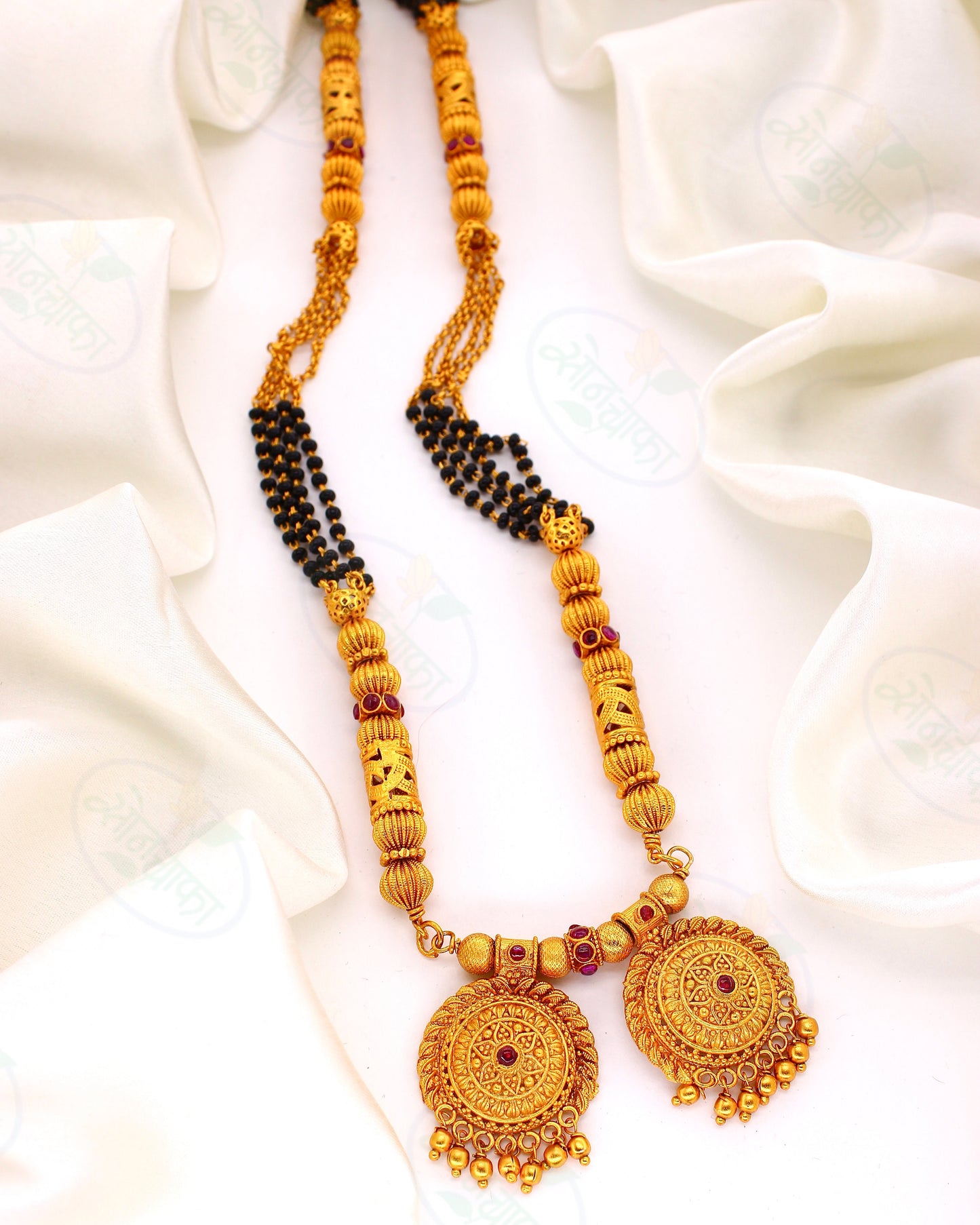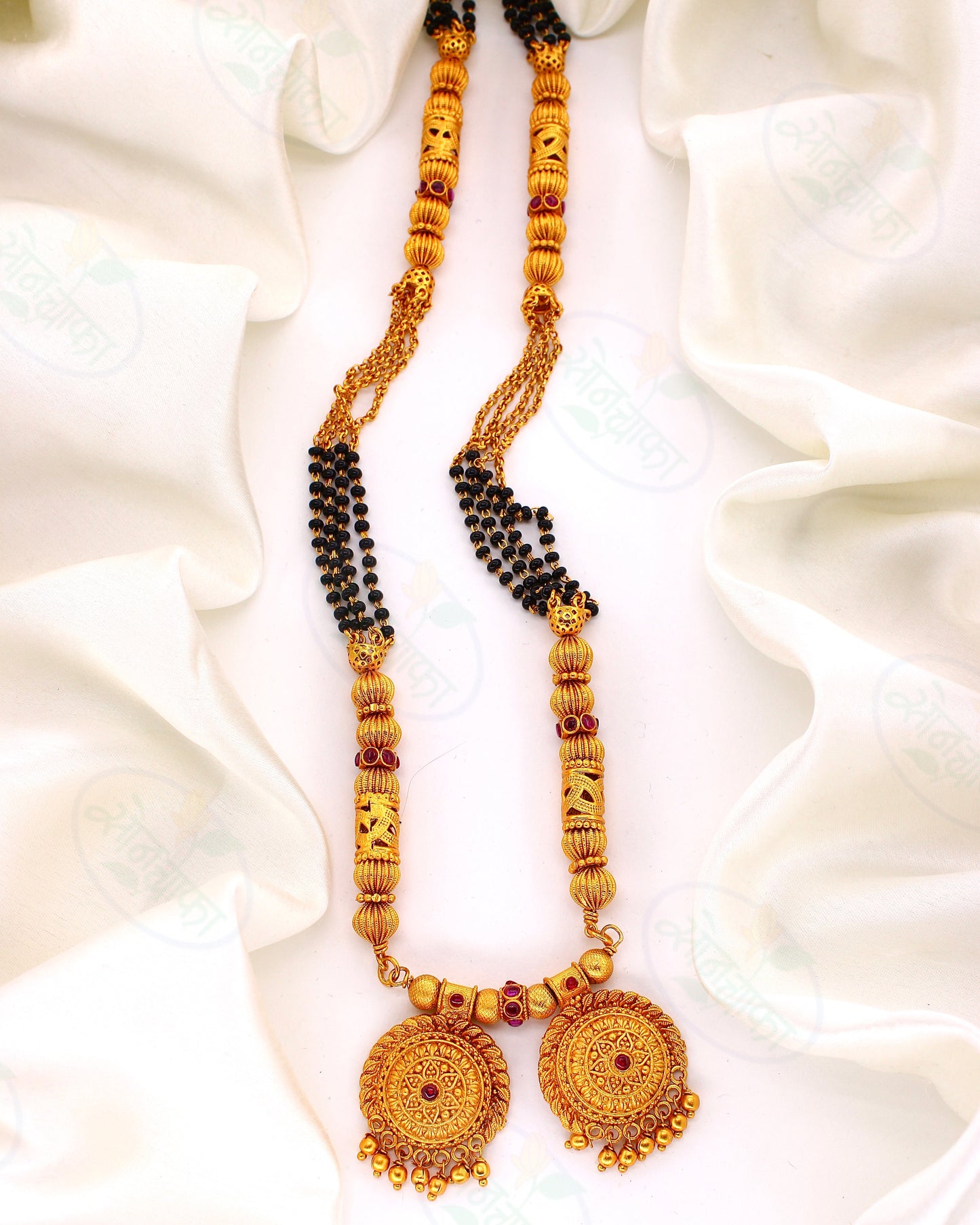 Complete your Maharashtrian look by clubbing this Floral adorable mangaslutra with your paithani saree from Sonchafa Jewellery. The three layer black beaded chain is styled with pink stones. This Mangalsutra is easy to wear and comfortable to hold all day long.