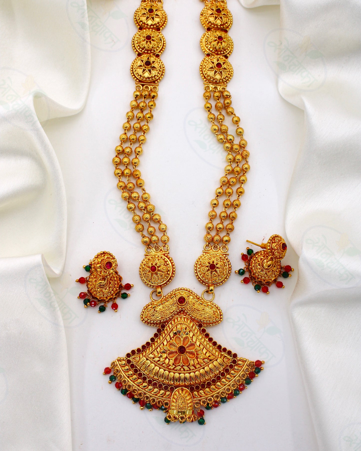 Upgrade your jewellery collection by adding this floral design necklace set from Sonchafa Jewellery. It is made from matte gold finish metal along with studded pink stones and feature wonderful floral design on metal surface. It is woven with matte golden beads along with wonderful design for more attractive look.