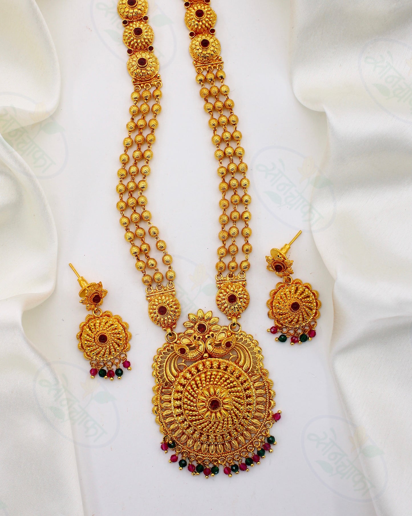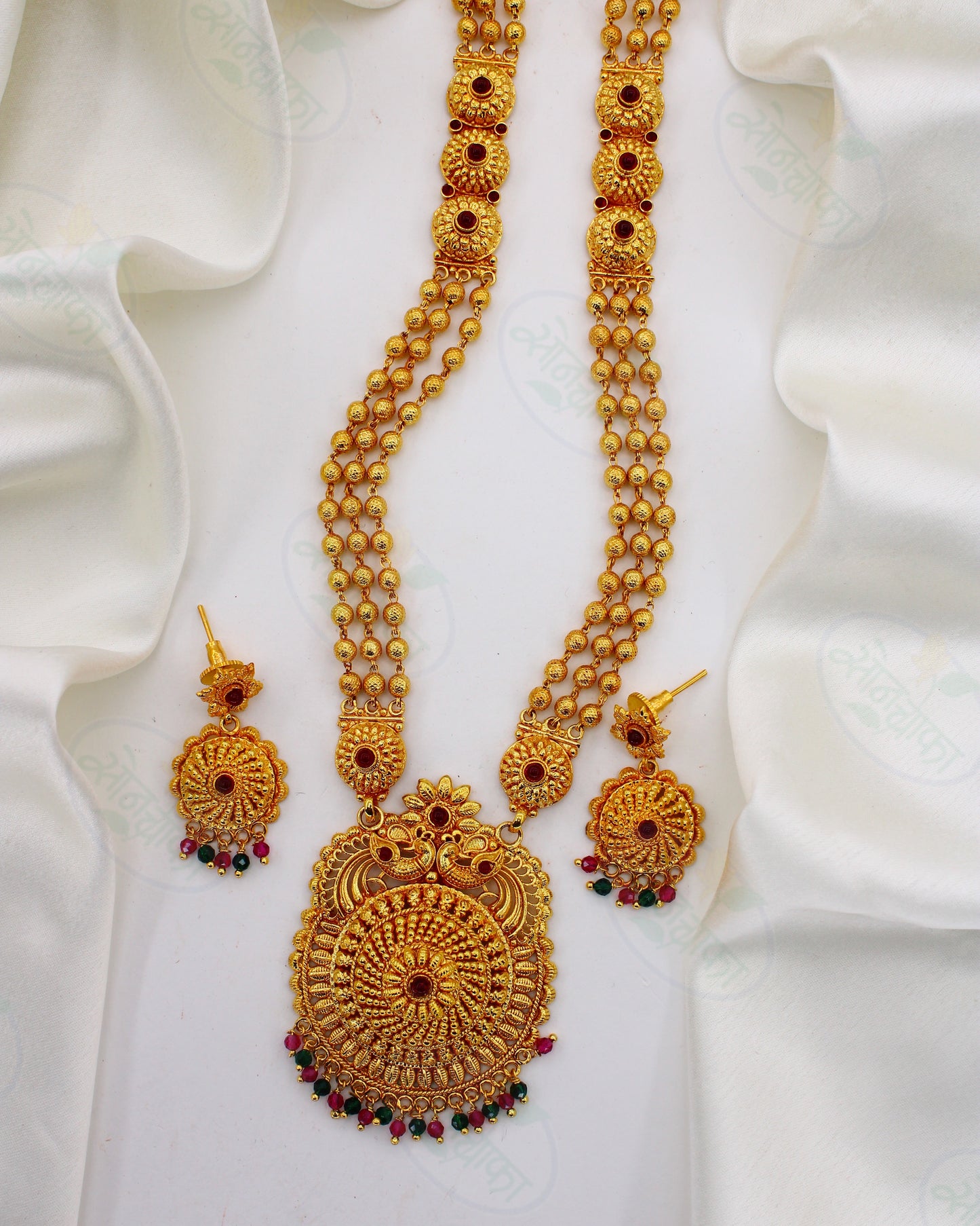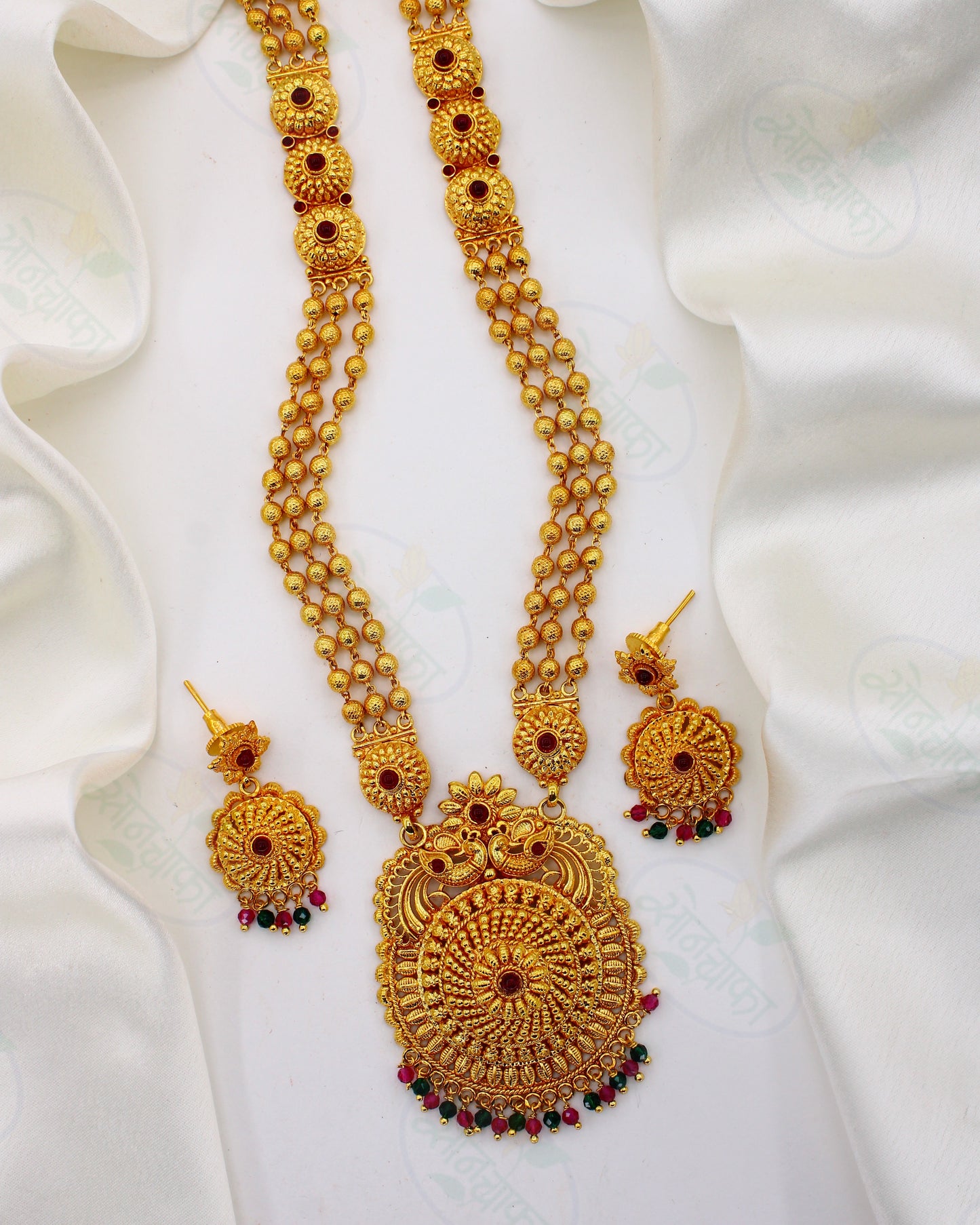 Exclusively designed this Blossom matte golden finish appealing necklace set from Sonchafa Jewellery is best pick for fashion conscious women like you. The pendant is encrusted with sparkling pink stones and has golden beaded necklace. This royal design necklace set is made from metal and ensures high durability. In addition it has matte golden bead droplet for added attraction
