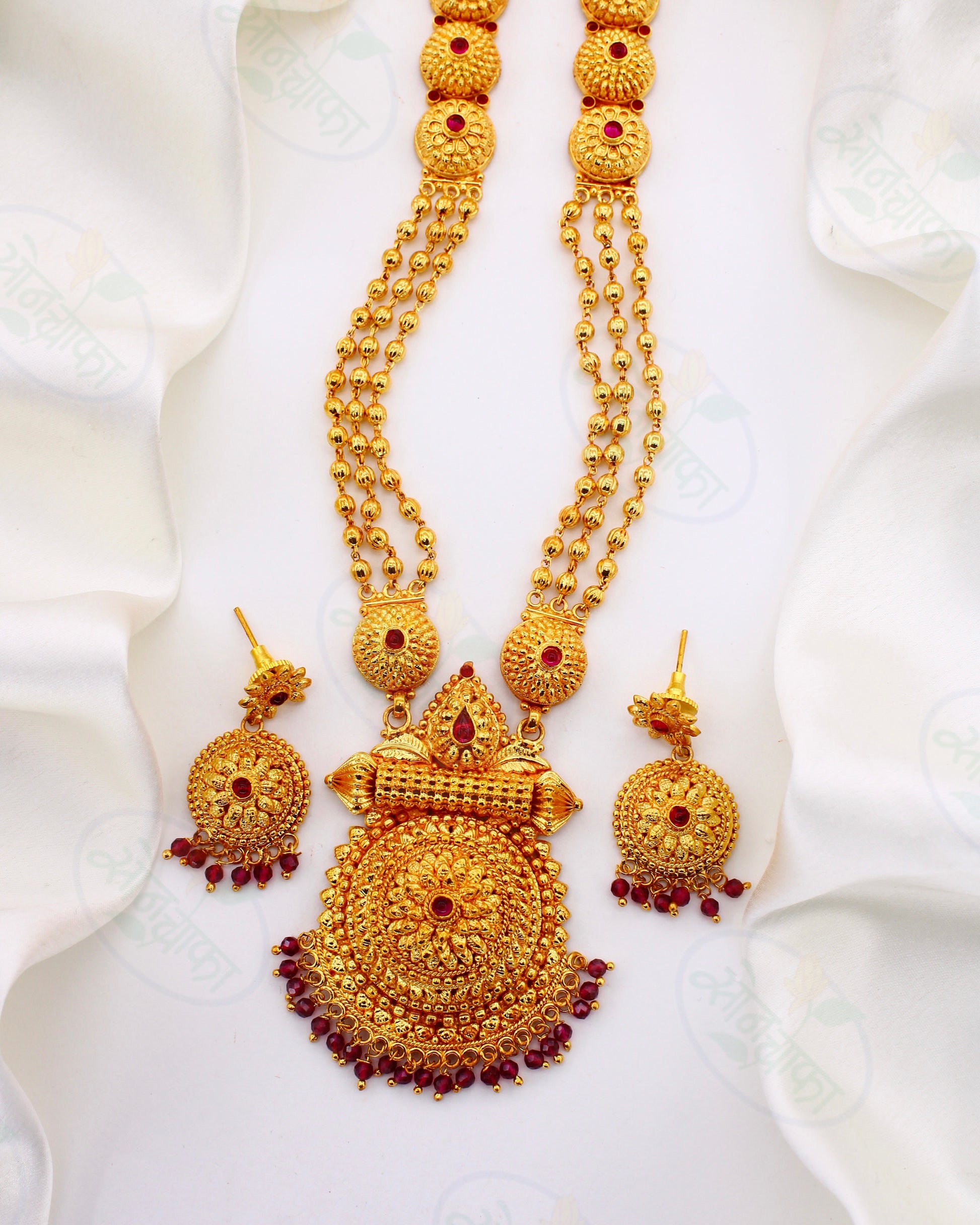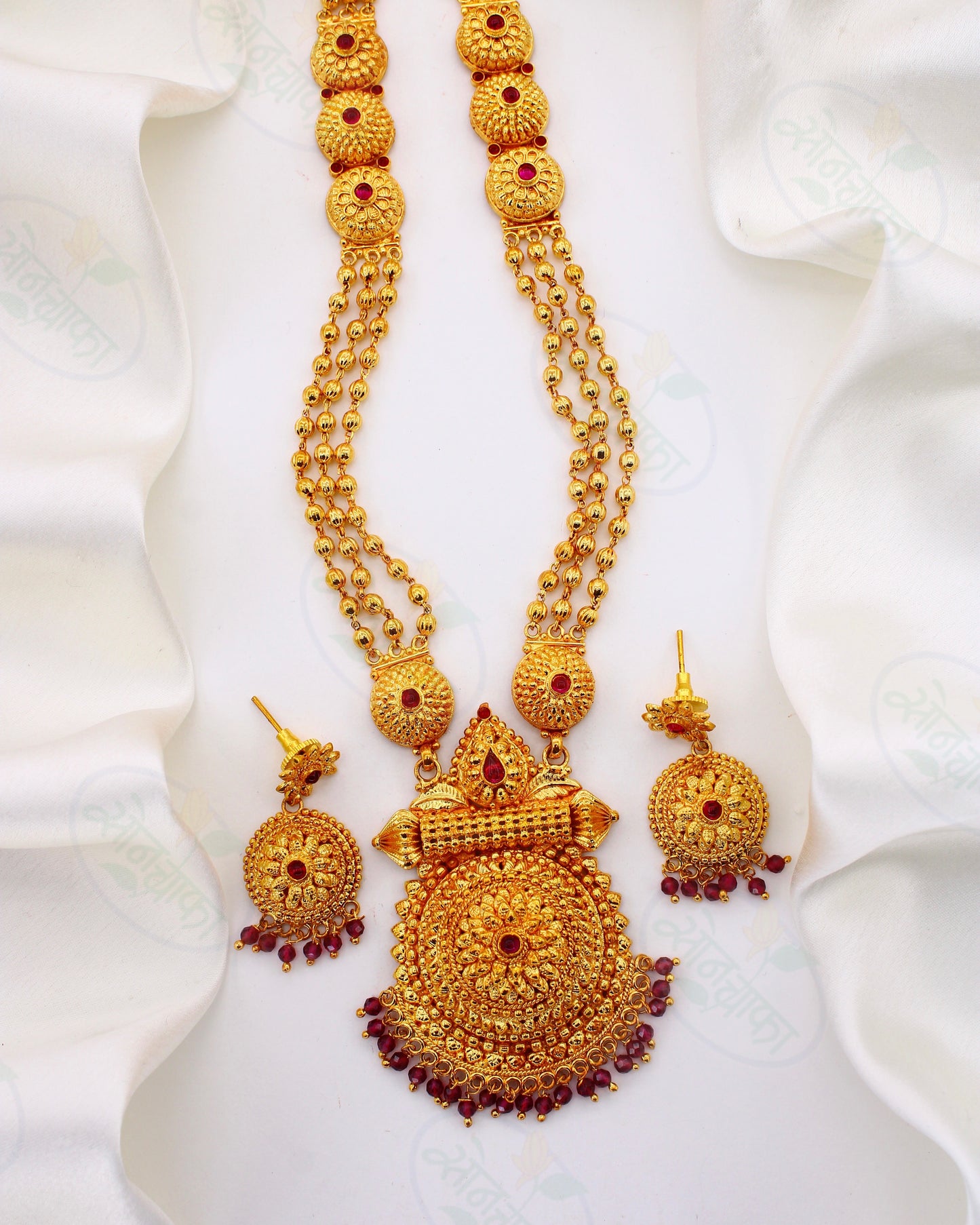 Beautifully designed this temple matte finish necklace set from Sonchafa Jewellery is something which will make you look outstanding. It features eye-pleasing intricate carving temple design on metal surface along with broad chain string. This temple necklace set is superior in quality and will be your fashion companion for many years.
