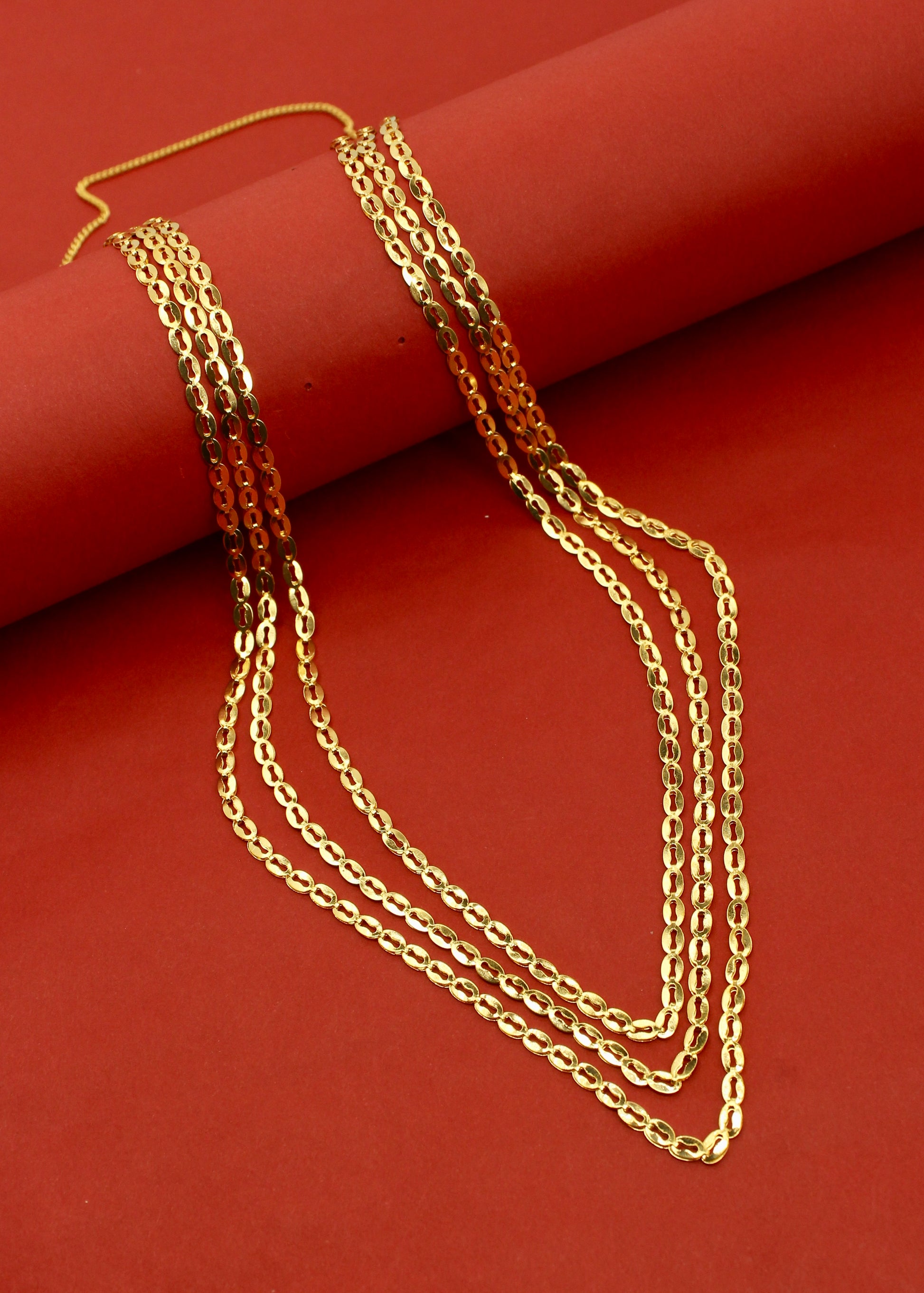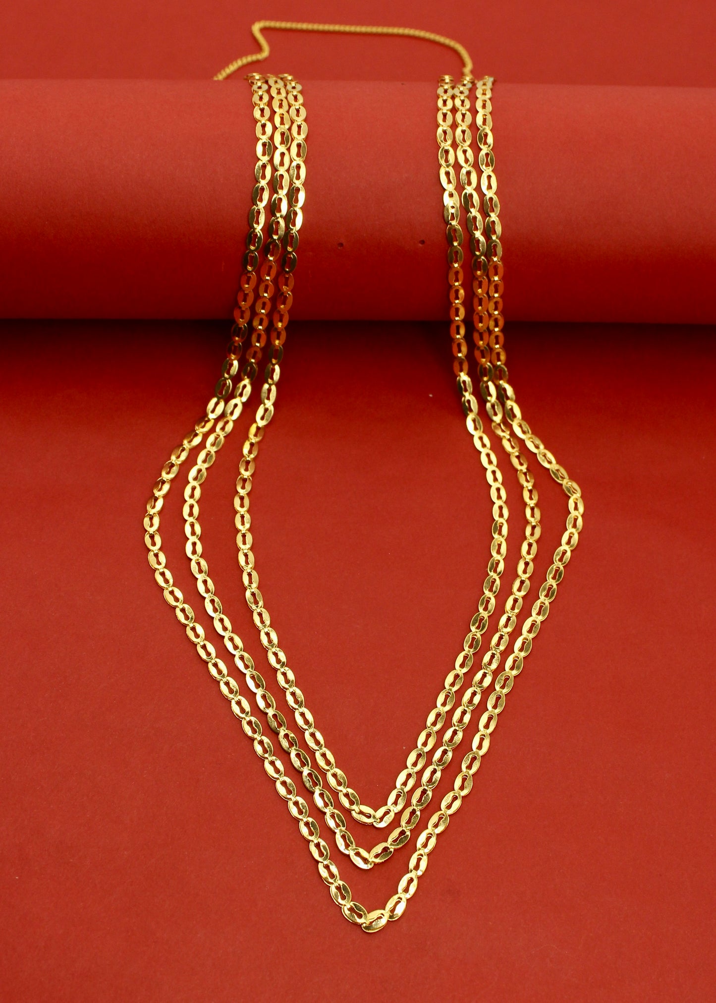 Sonchafa Jewellery offers this 1 gram gold plated beautiful Traditional triple layer Chapla Haar to complement your traditional look. It is wonderfully woven in triple layer golden chain. It is made from golden finish metal and ensures skin-friendliness.