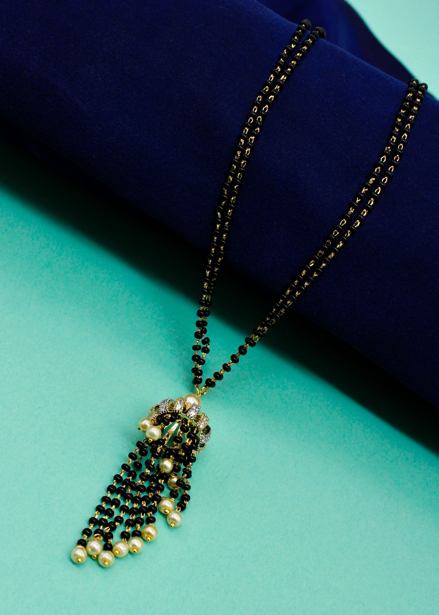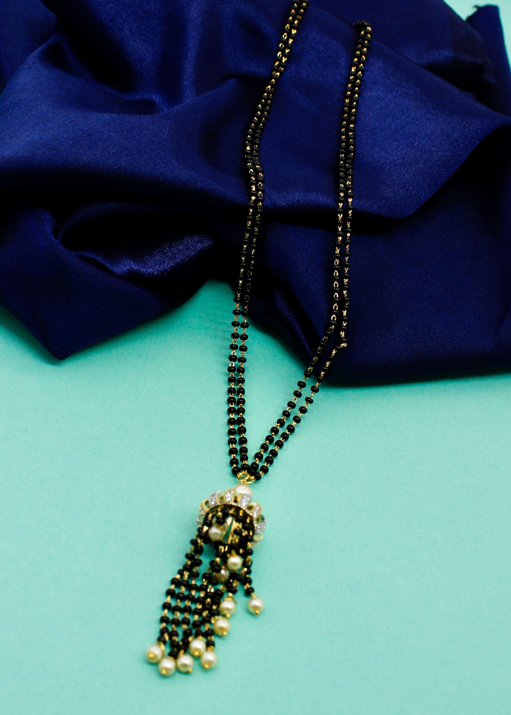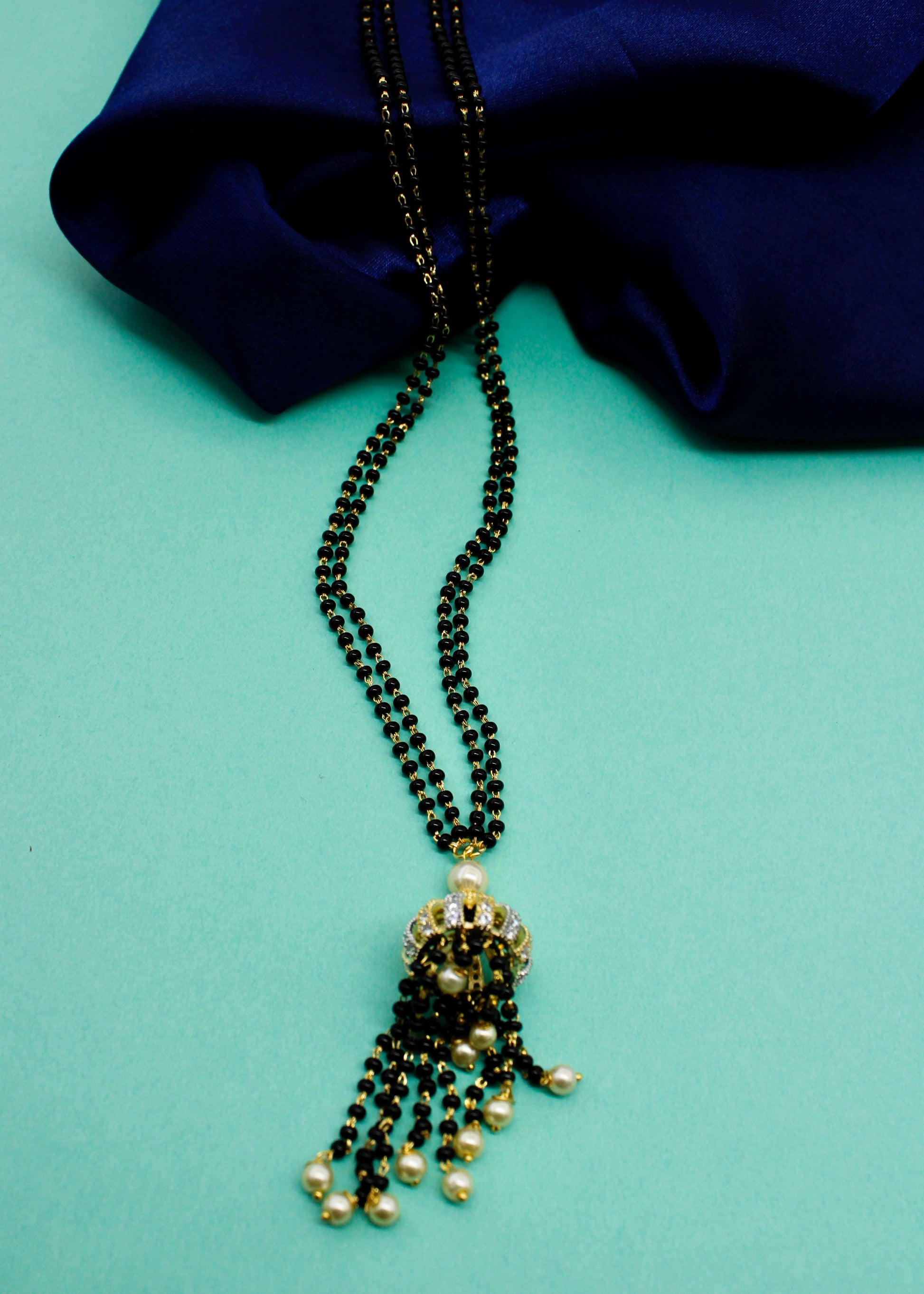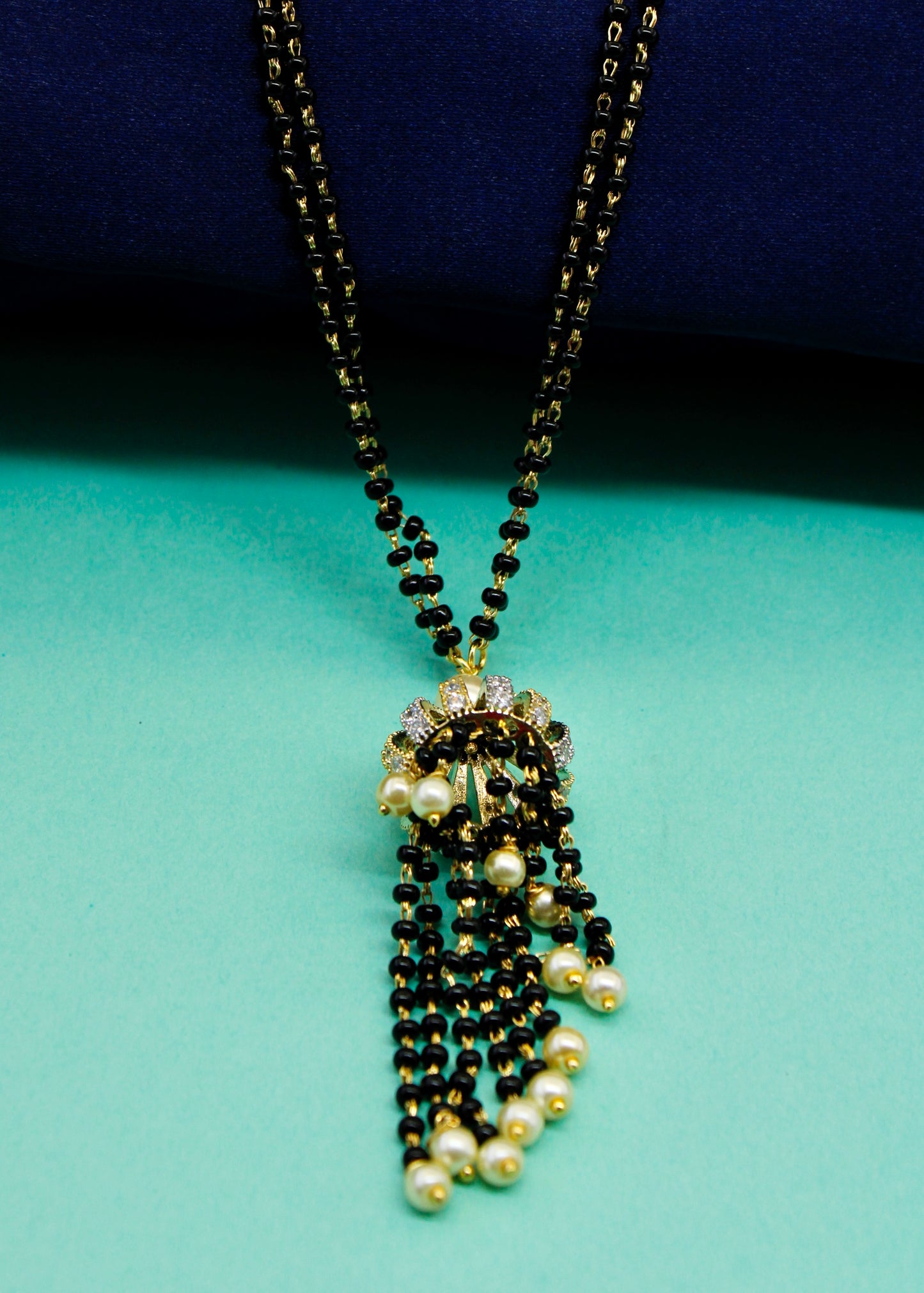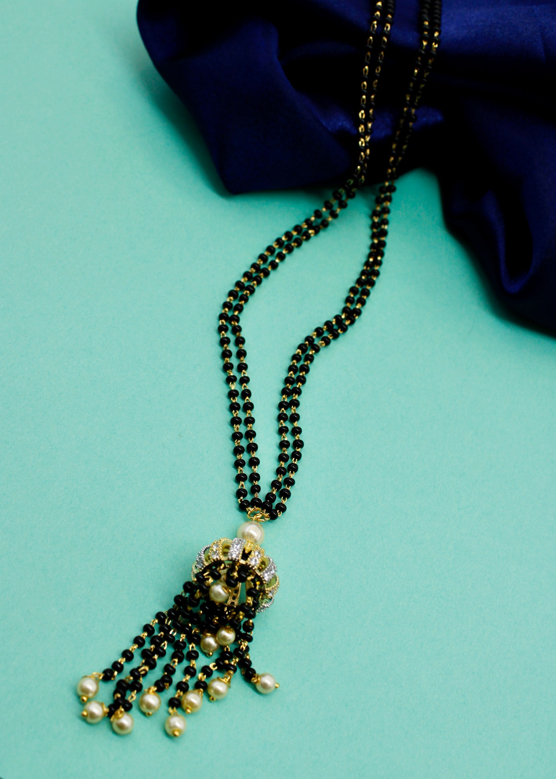 Gold, Silver finish designer mangalsutra set from Sonchafa Jewellery will strike you at very first look. This mangalsutra styled with precious dia diamonds stone and made from silver, gold finish metal. It is easy to use and comfortable to hold all day long.