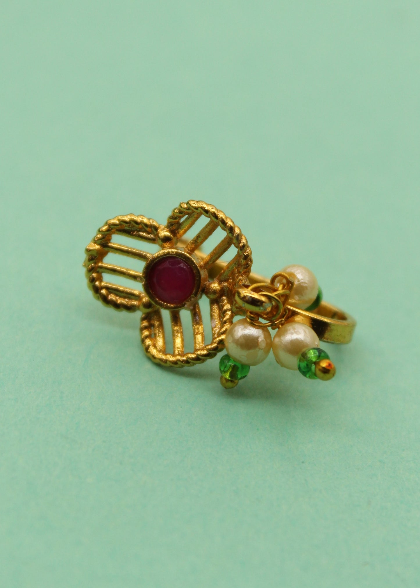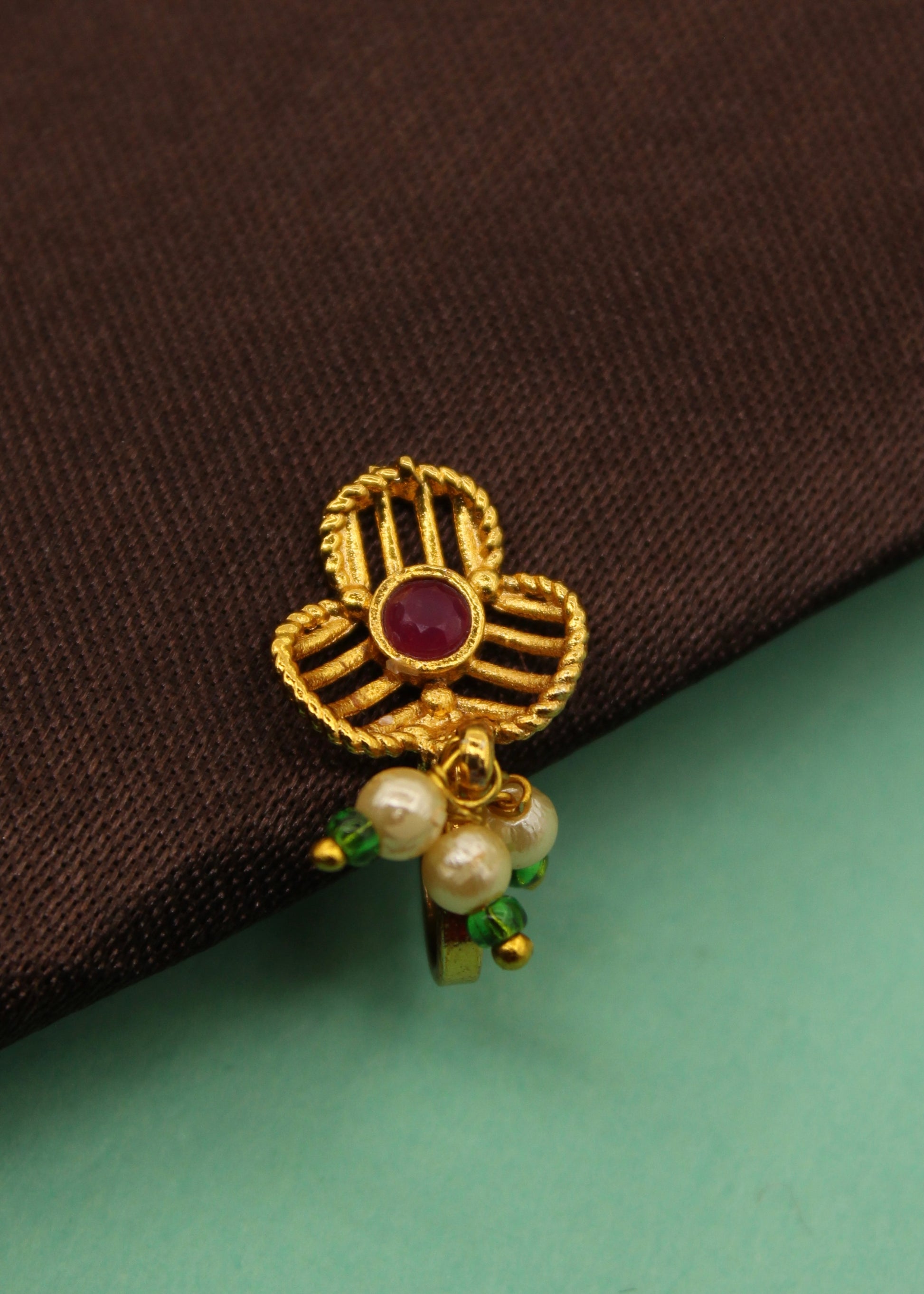 Get the perfect classy look by wearing this beautiful nath with your casual outfits. It is studded with pink colour stones and style with good quality pearl beads. This nath is crafted from highly durable antique golden finish metal. This nath is easy to wear and press on.