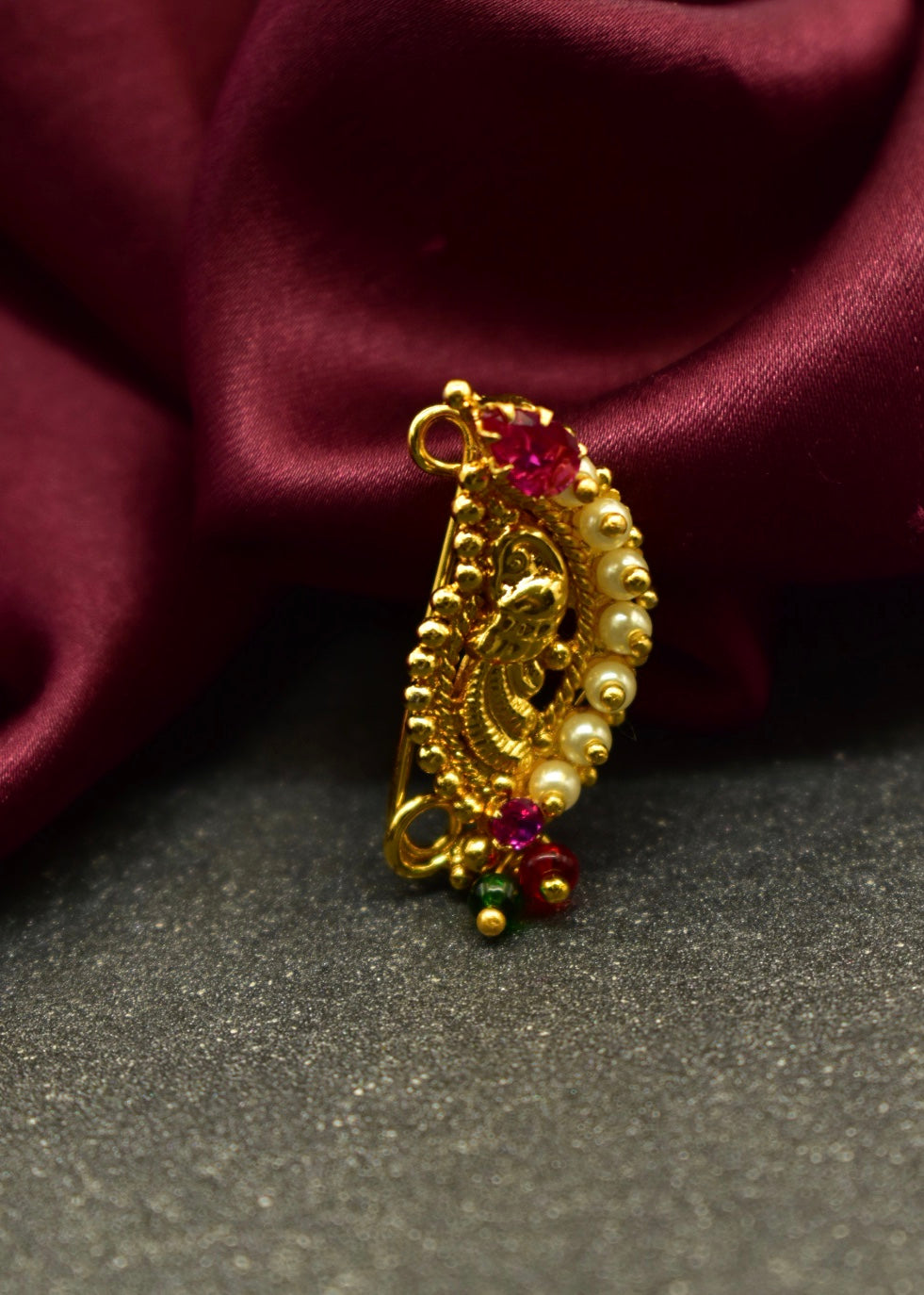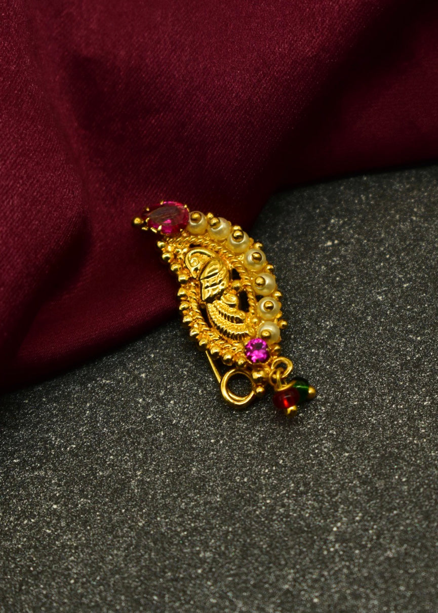 Gracefully crafted this attractive leaf design nath from Sonchafa Jewellery is purely adorable. It is encrusted with sparkling pink stone & studded with good quality pearls beads along with red-green beads. This golden metal crafted nath is skin-friendly and press on.