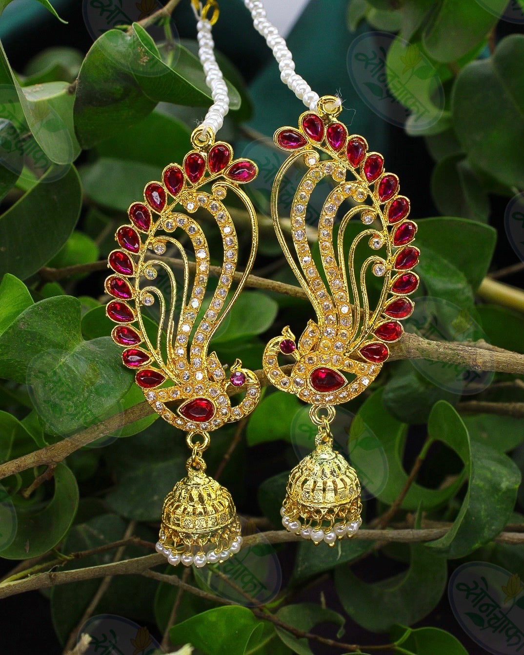 Adorn your ears with this pair of wonderful ear-cuffs which is best to team with traditional costume. They are encrusted with pink-green stones along with golden finish metal. In addition these ear-cuffs have pearl bead droplets for added attraction.