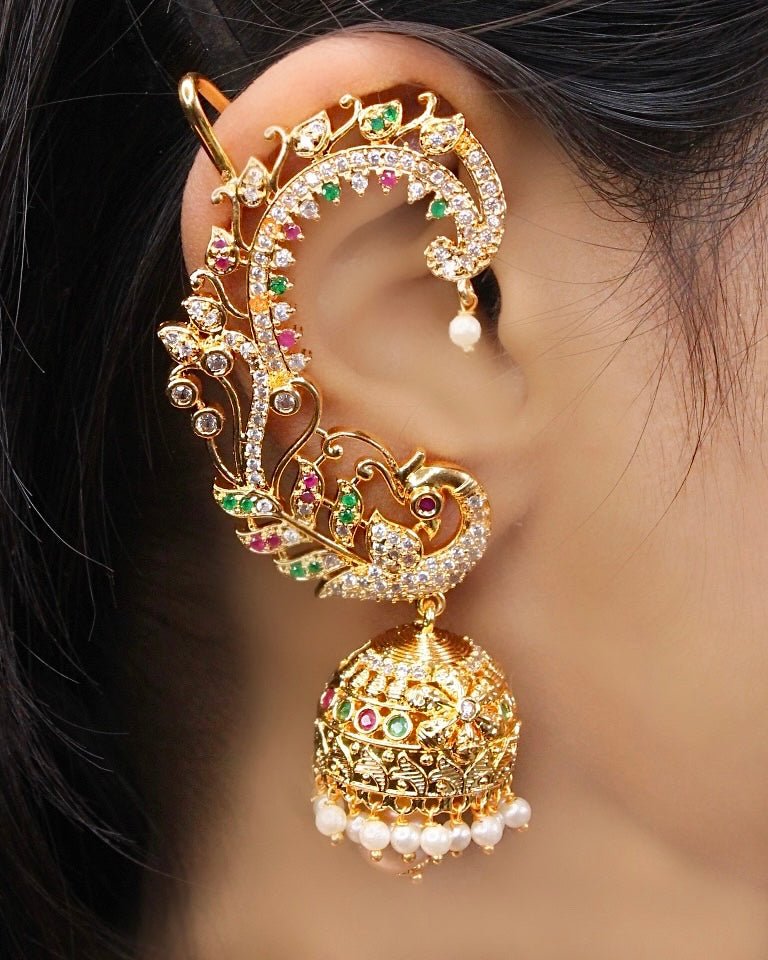This golden finish flower styled designer ear-cuffs from Sonchafa Jewellery for our traditional look. It is styled with sparkling shimmering pink green stone and made form golden finish metal. These ear-cuffs are easy to wear as they are clip-on.