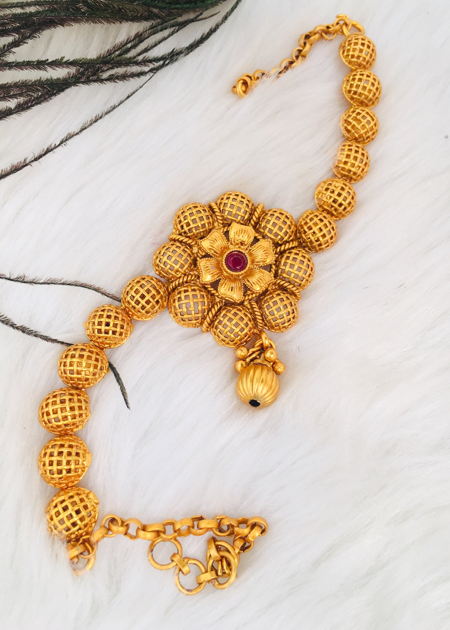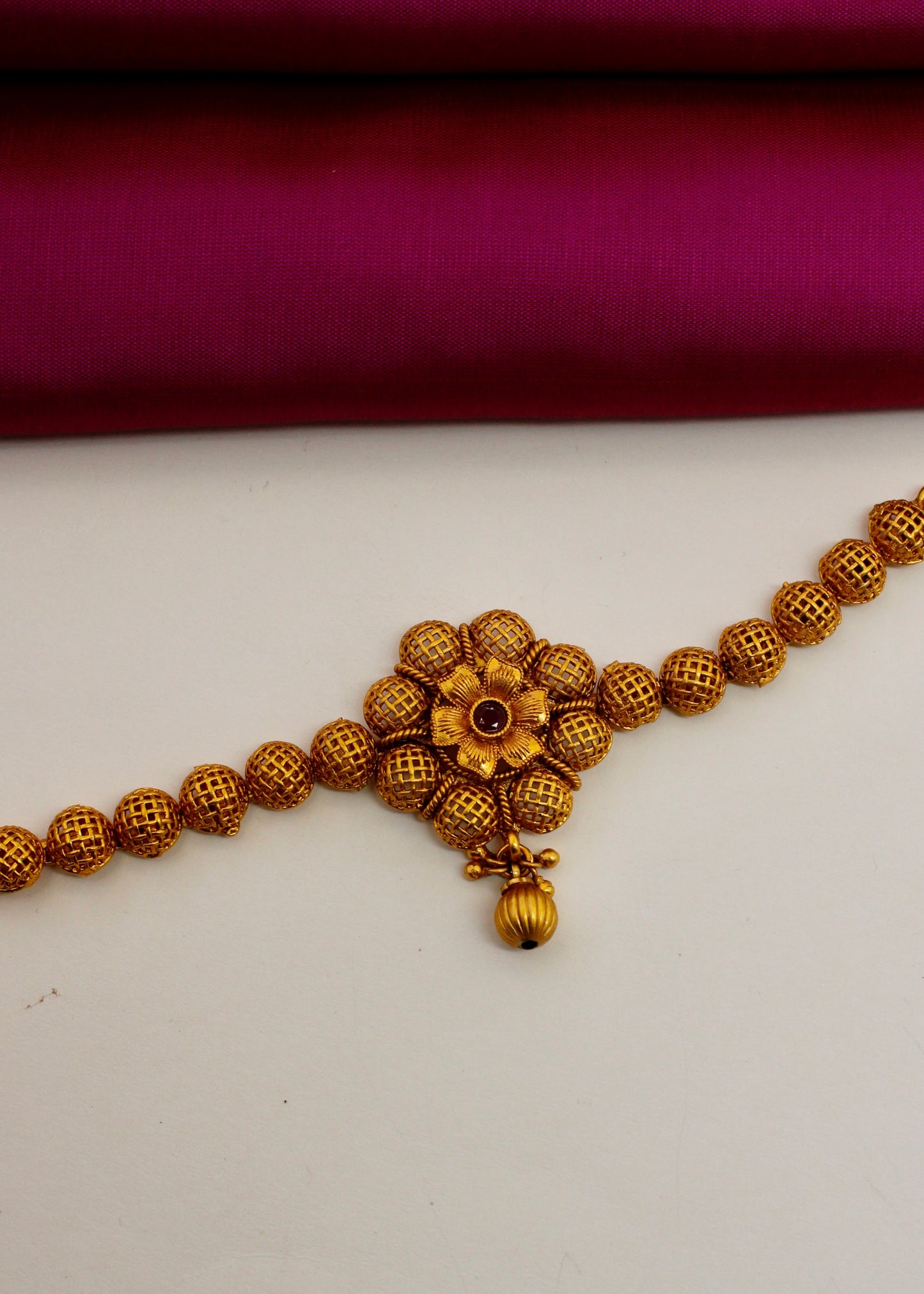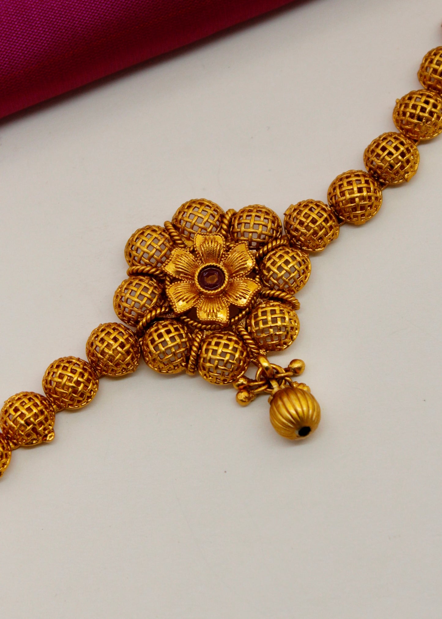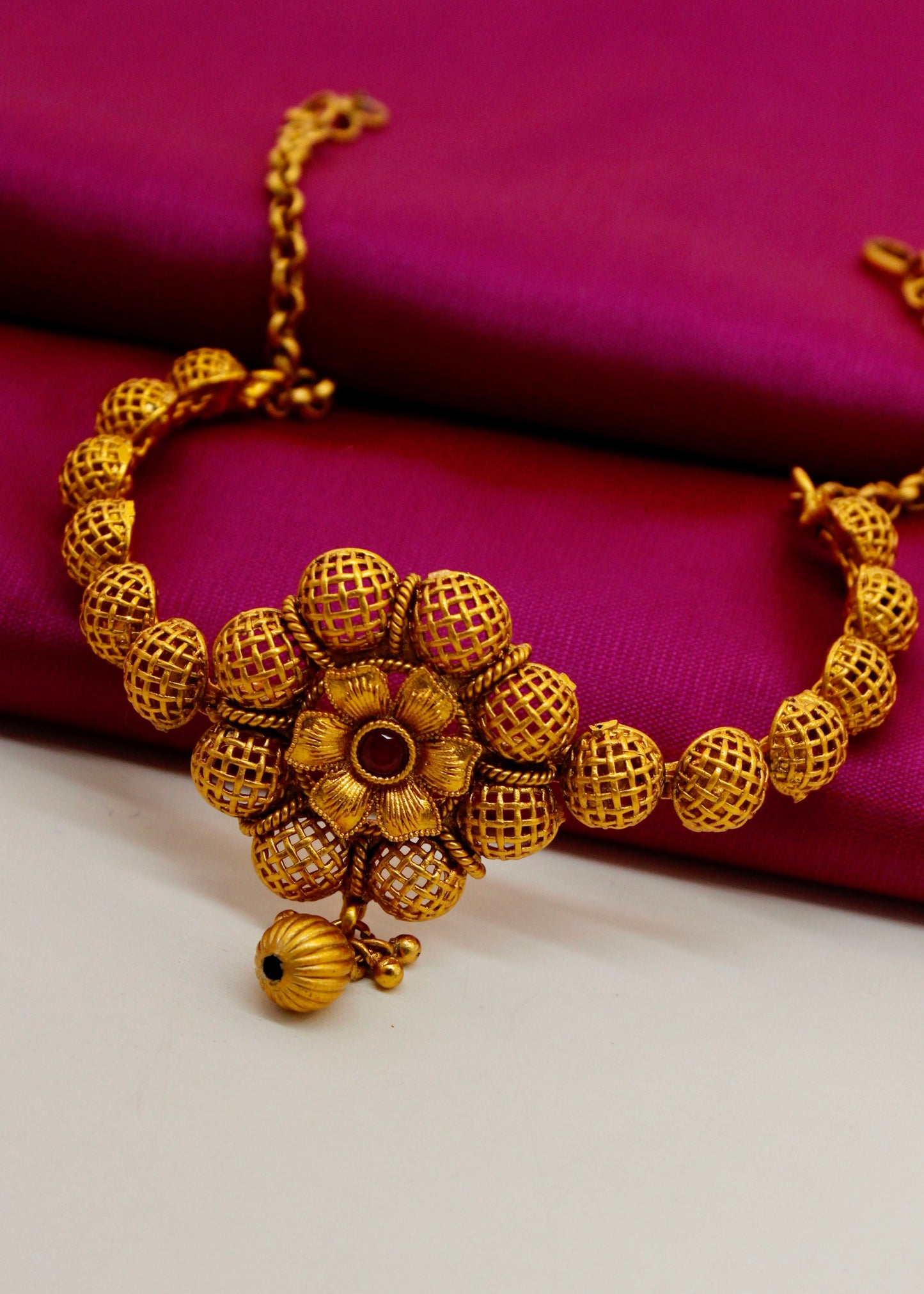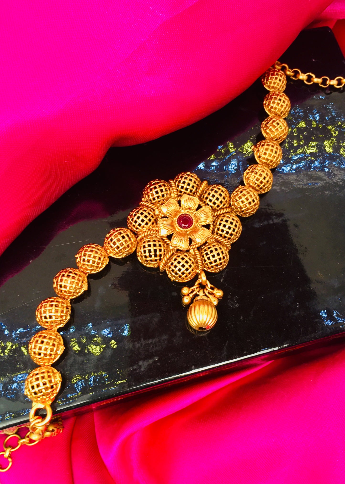 Look absolutely gorgeous by clubbing this Jali design waki with your traditional costume. It is embedded with sparkling kemp stone along with golden beads and made from metal. This waki has golden beads droplet for added attraction.