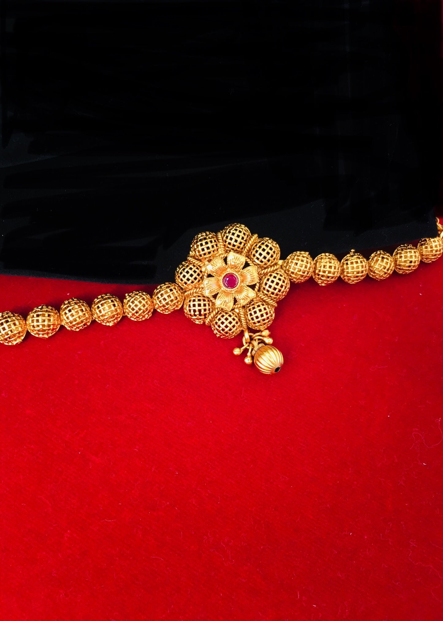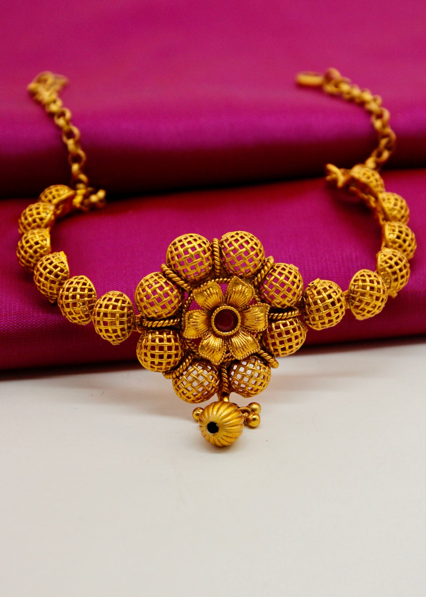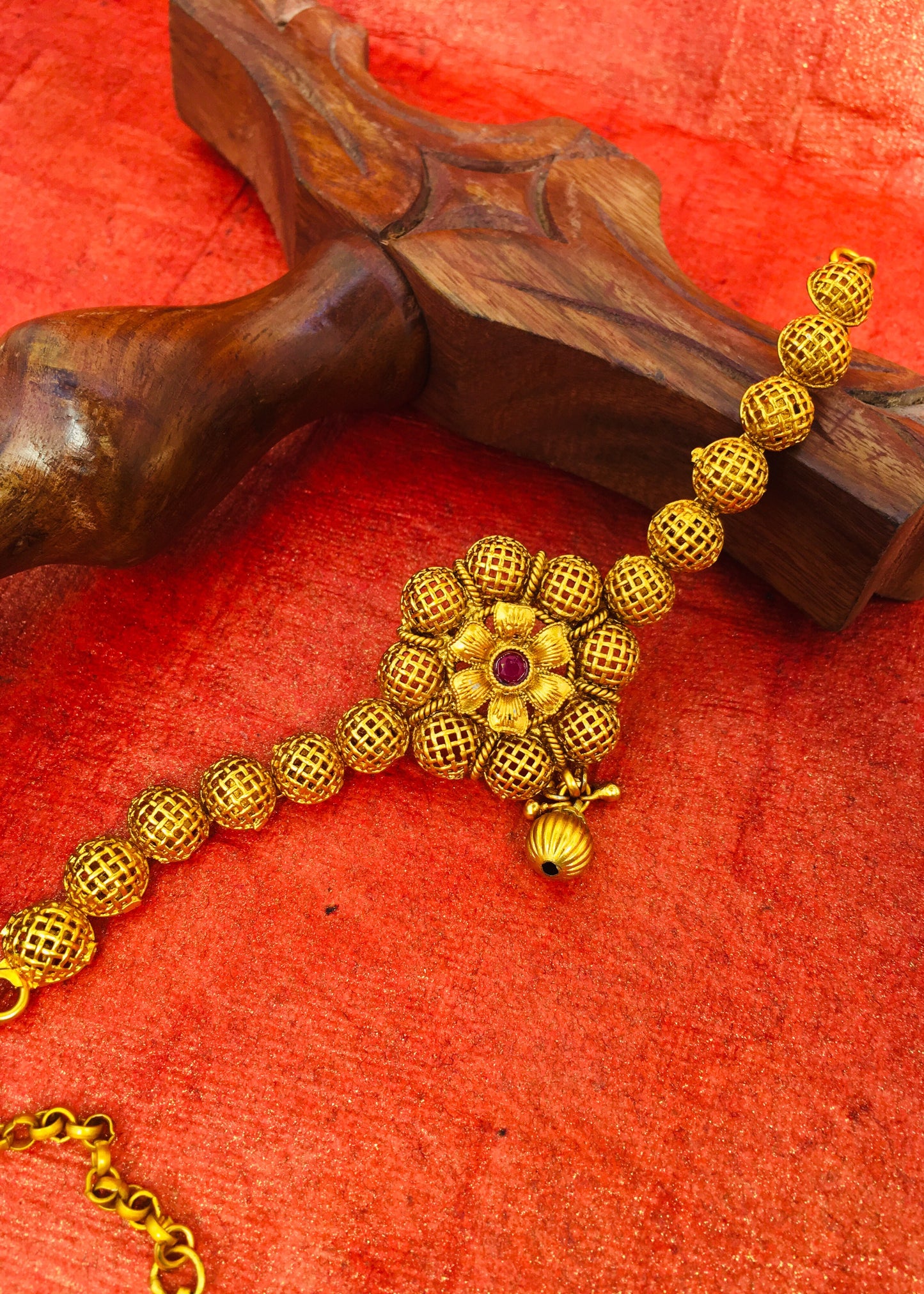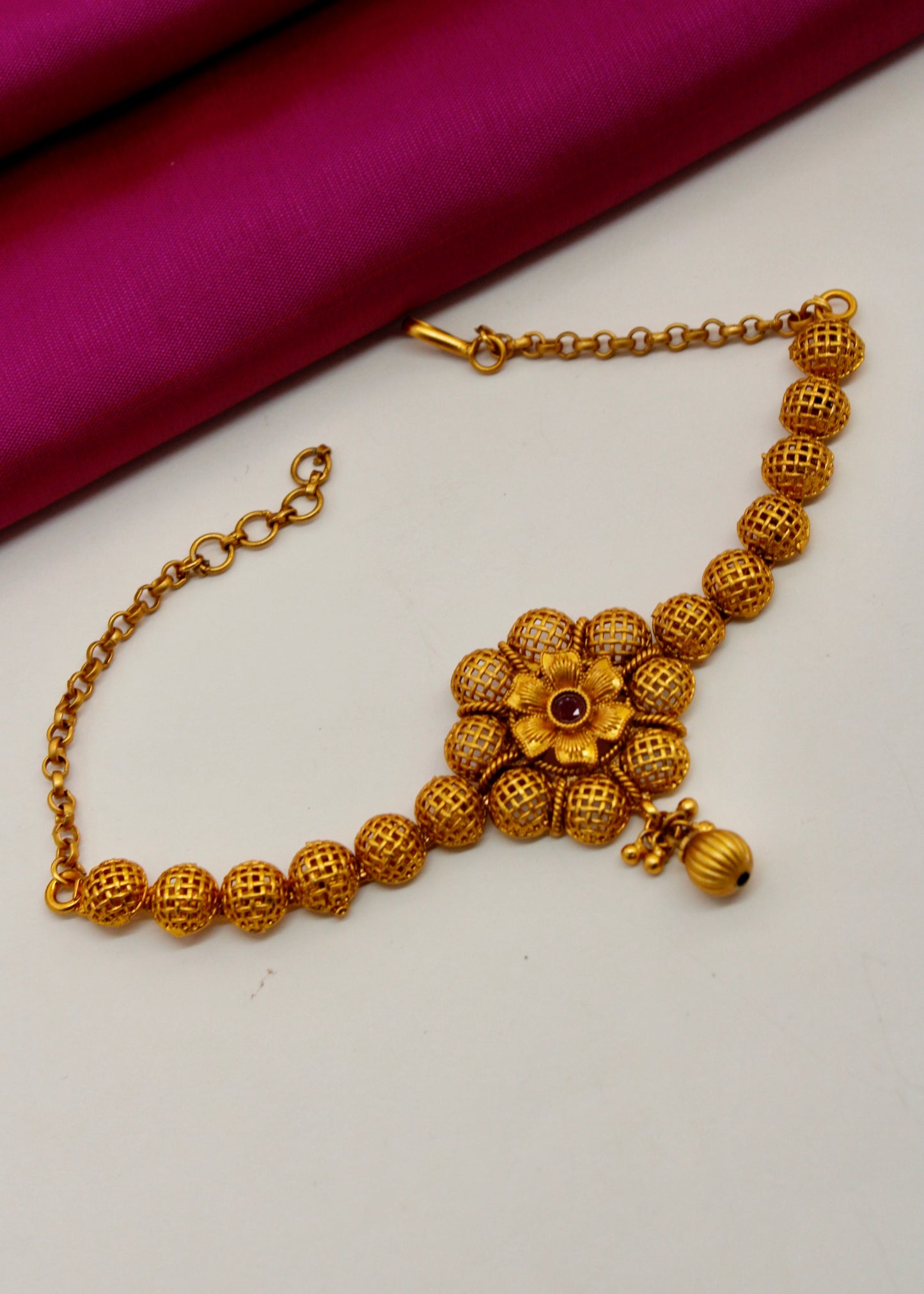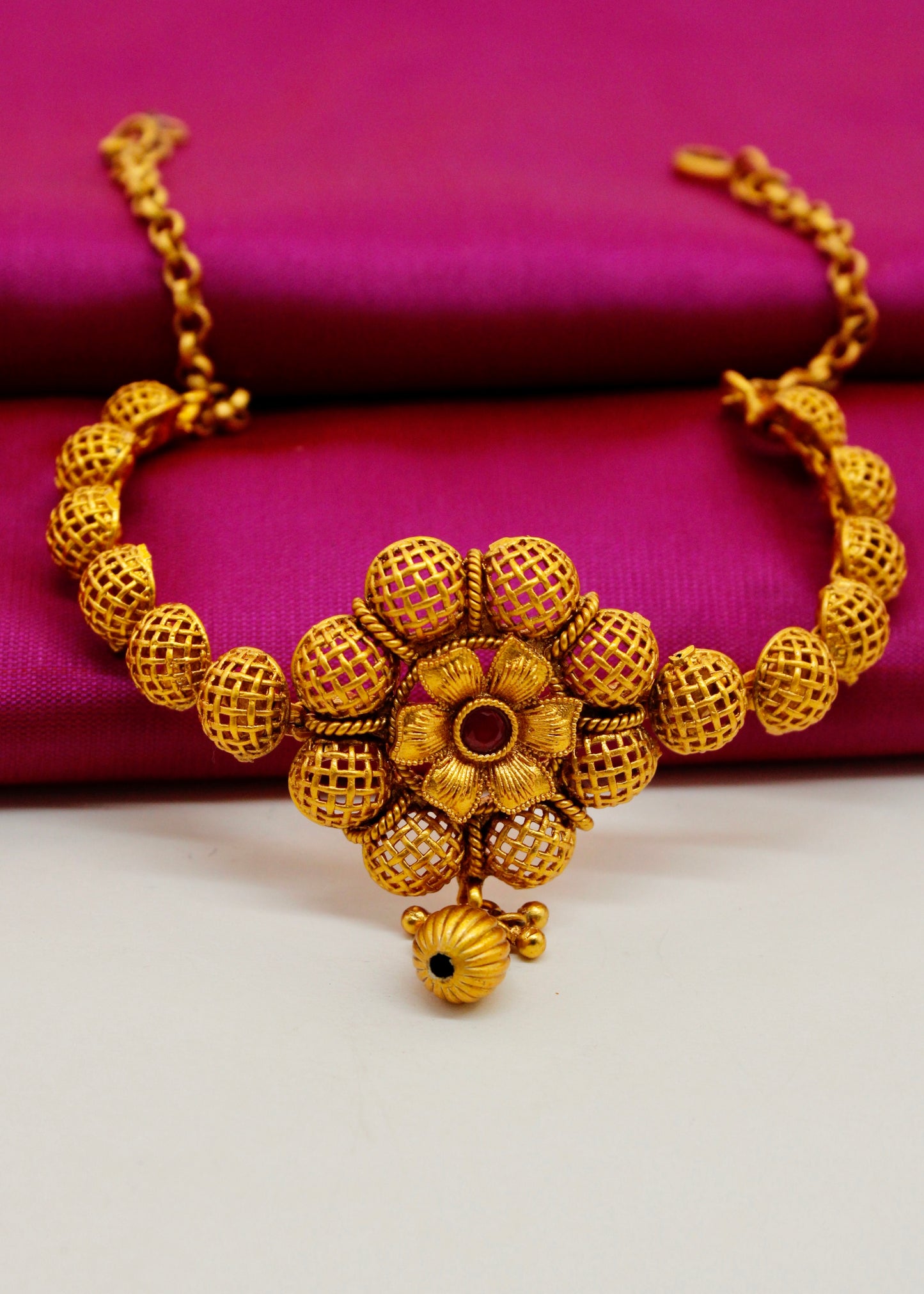 Look absolutely gorgeous by clubbing this Jali design waki with your traditional costume. It is embedded with sparkling kemp stone along with golden beads and made from metal. This waki has golden beads droplet for added attraction.