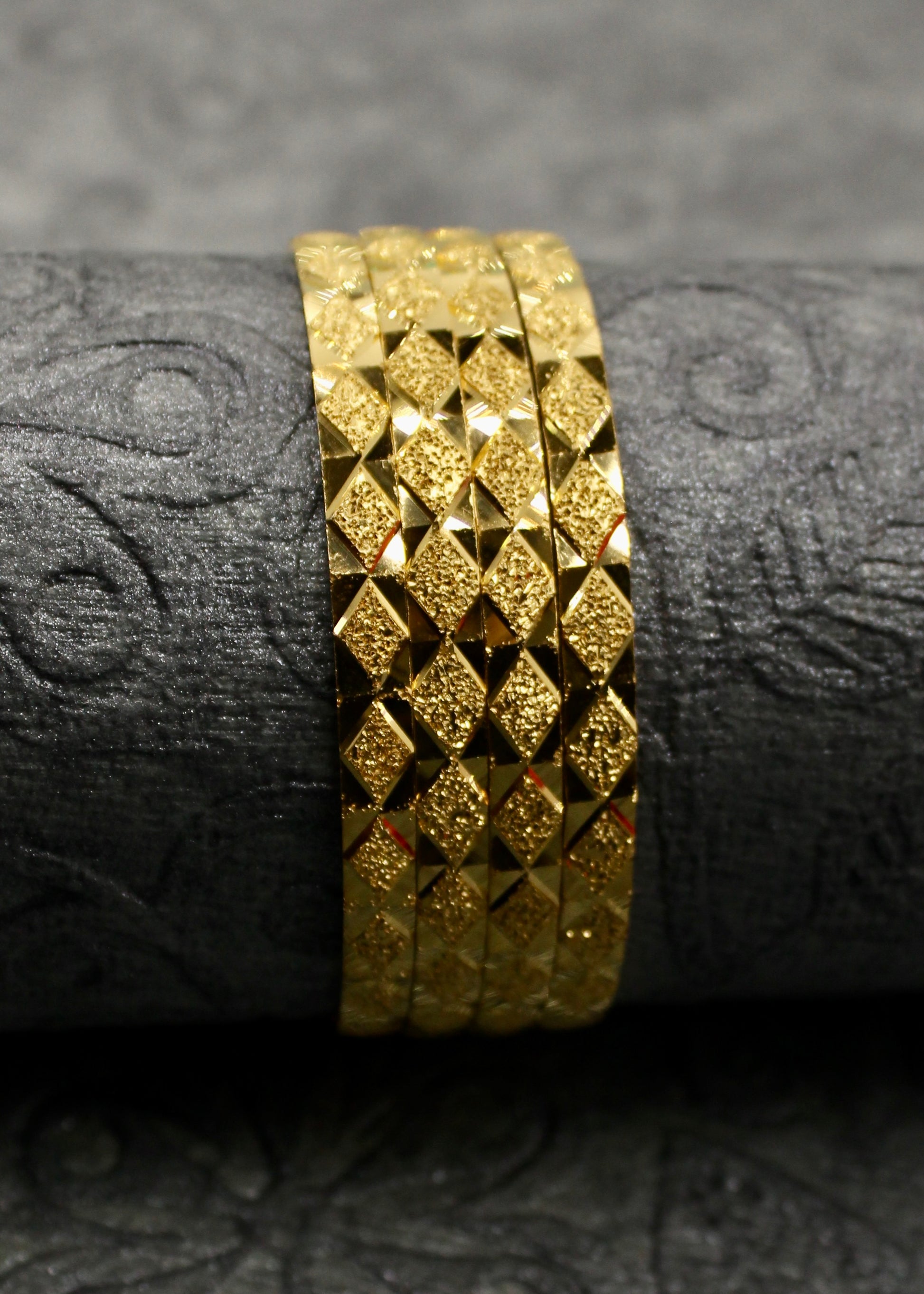 Must have in your accessory collection this gold plated set of 4 pc bangles from Sonchafa Jewellery. It is styled with attractive design on golden base. These bangles are fashioned from golden finish metal and ensures high durability. It is easy to wear and skin-friendly as well.