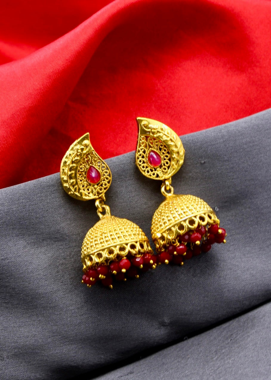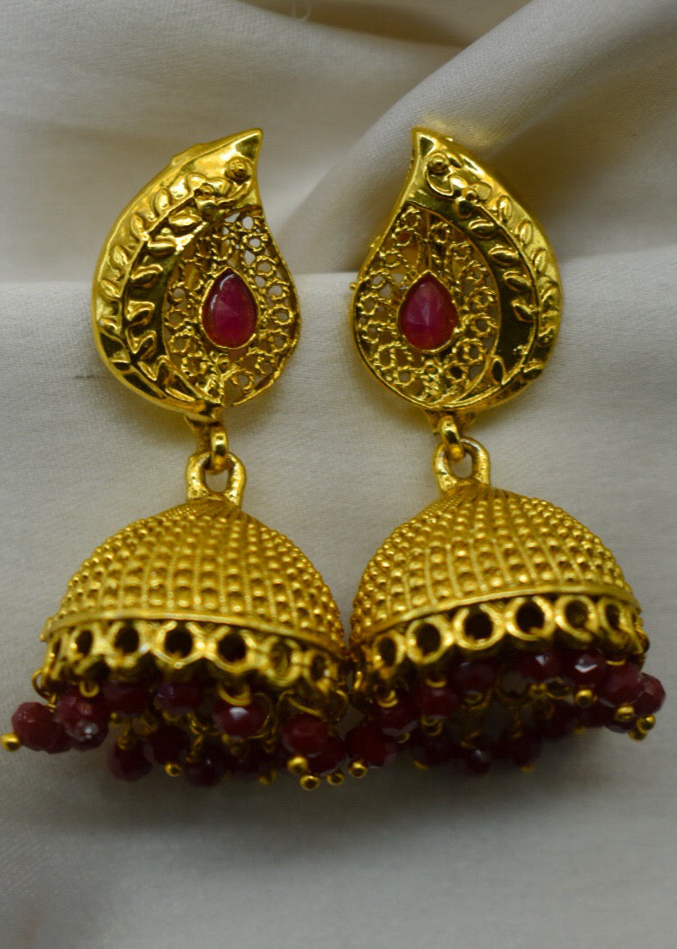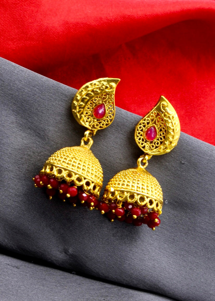 This trendy traditional jhumki earrings from Sonchafa jewellery for stylish women like you. They are encrusted with sparkling maroon beads and feature intricate carving design on metal surface. These jhumki have maroon, pearl bead droplets for added attraction.