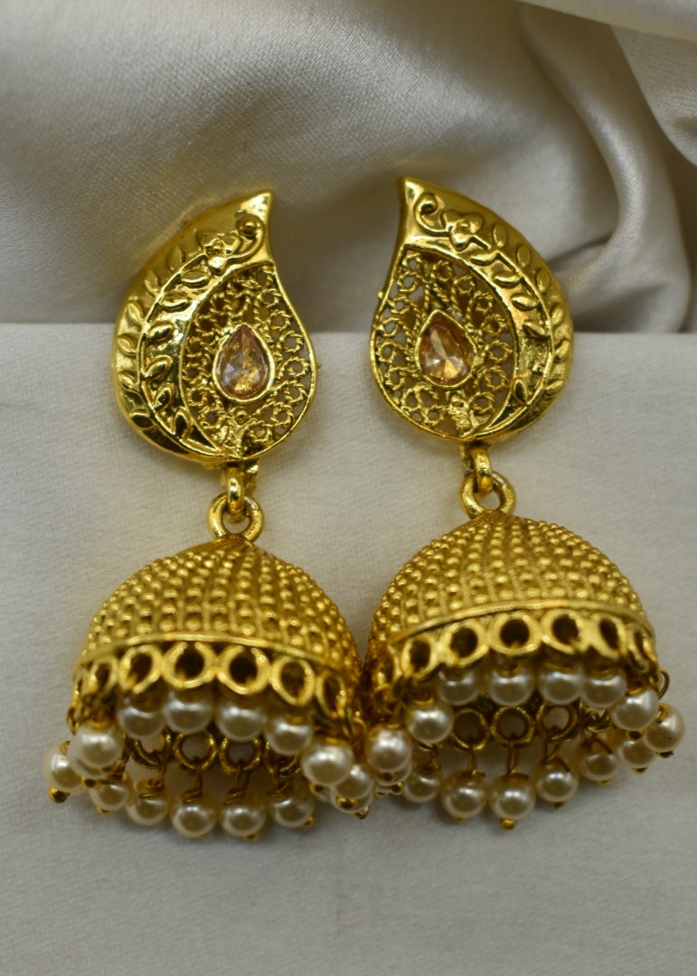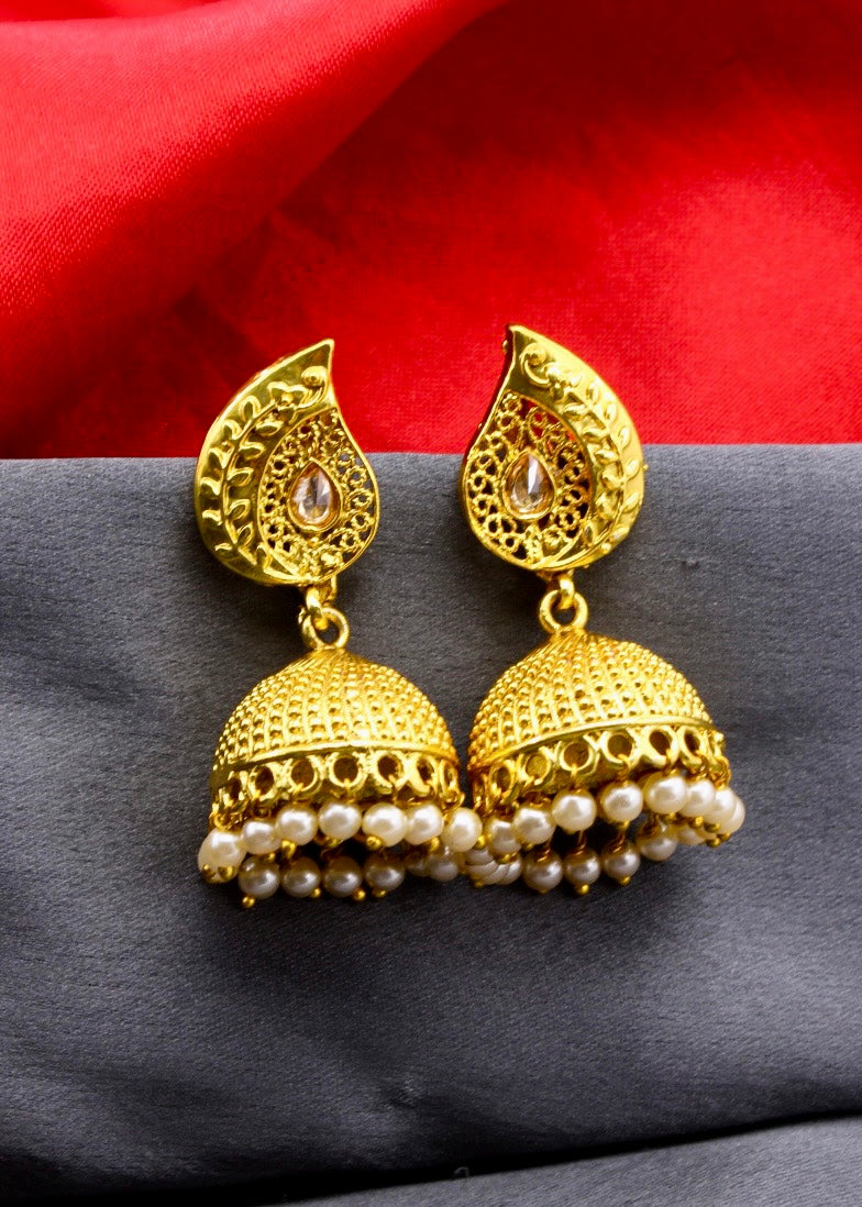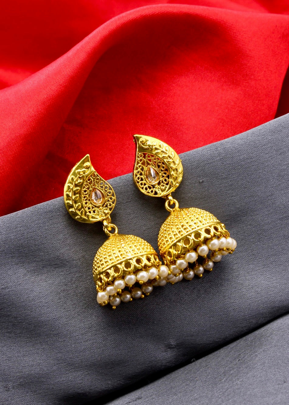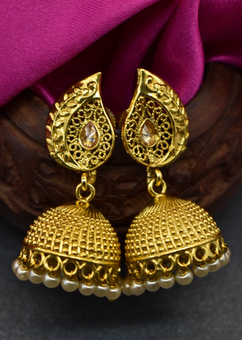 This trendy traditional jhumki earrings from Sonchafa jewellery for stylish women like you. They are encrusted with sparkling maroon beads and feature intricate carving design on metal surface. These jhumki have maroon, pearl bead droplets for added attraction.