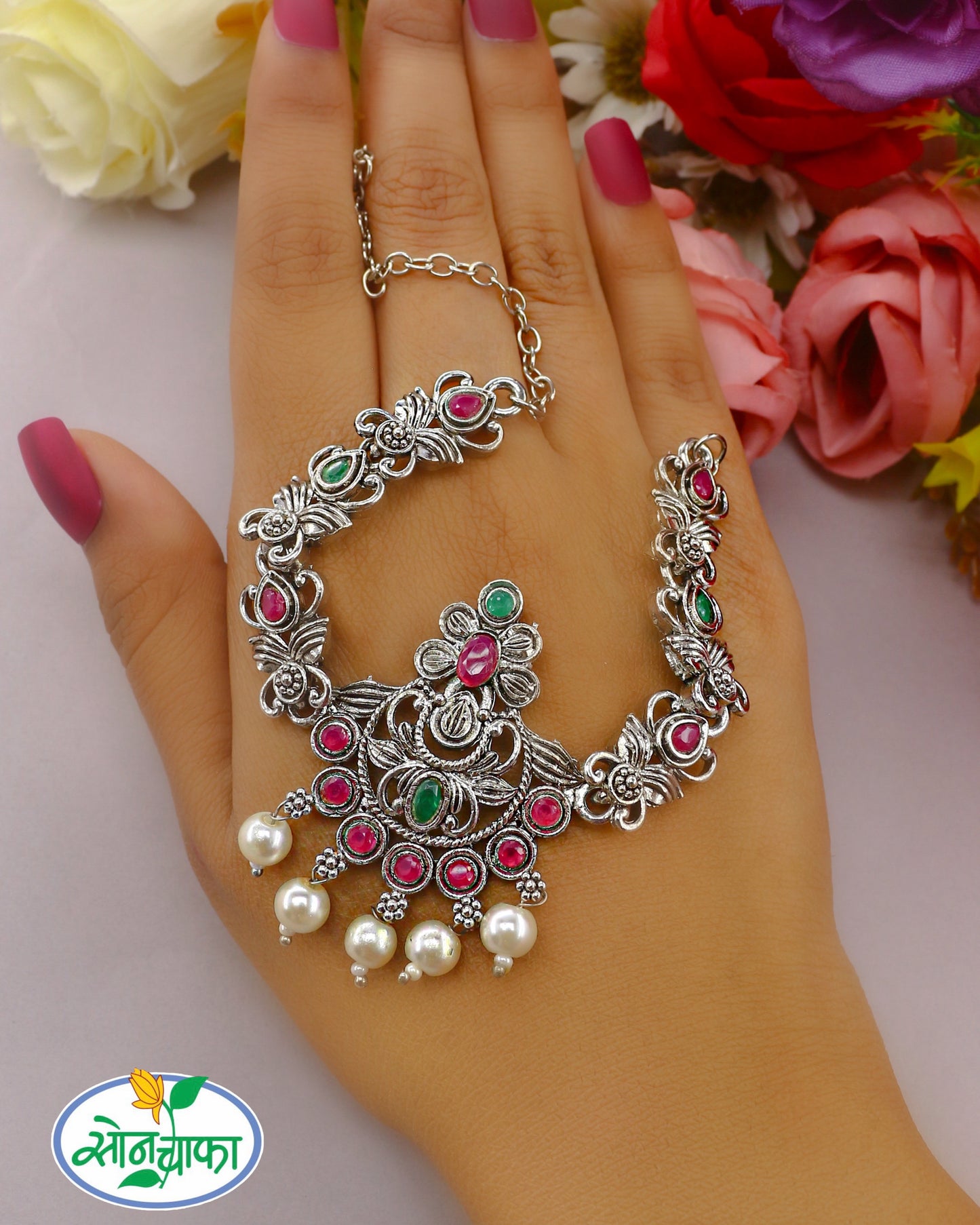 Be in spotlight by wearing this beautiful designer Waki It embedded with Pink, green stones and made from oxidised finish metal. This adjustable Waki design has oxidised bead droplets for added attraction.