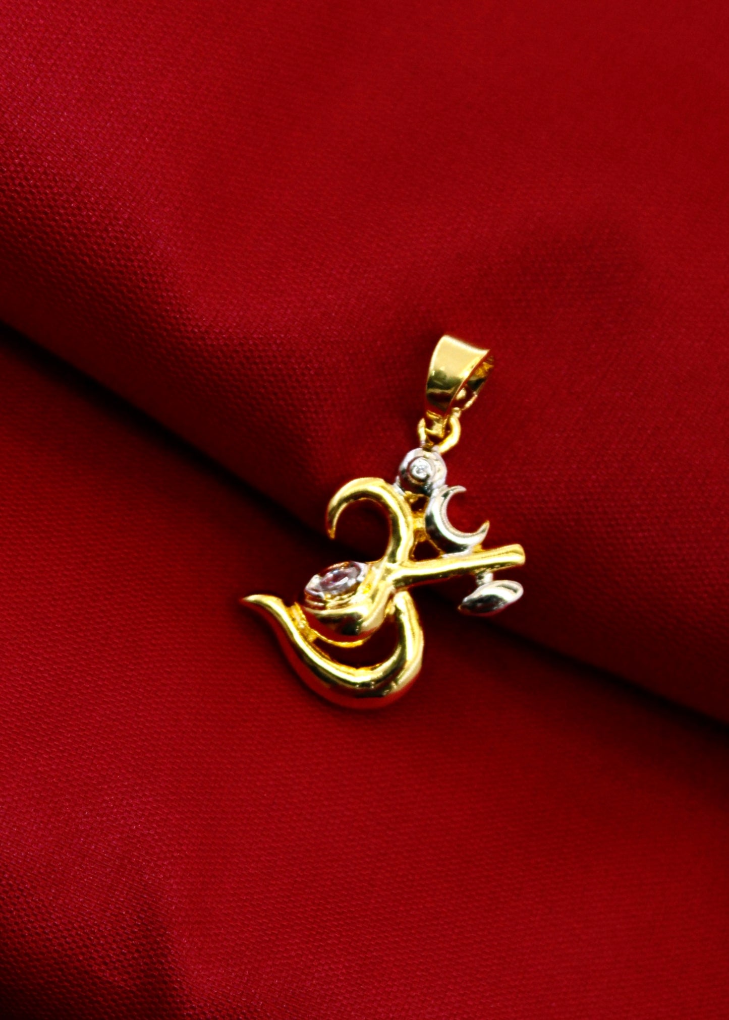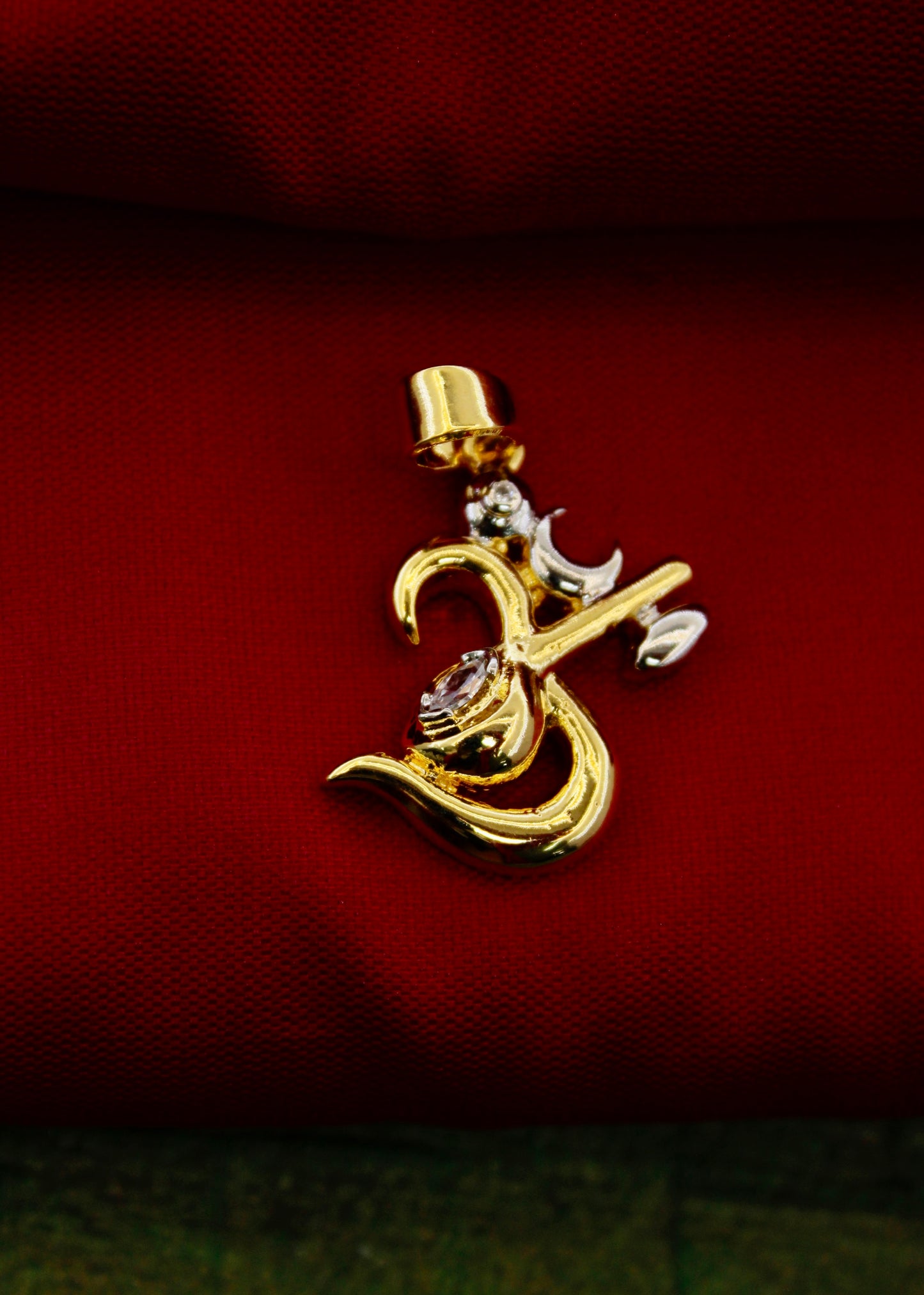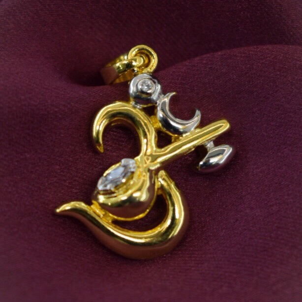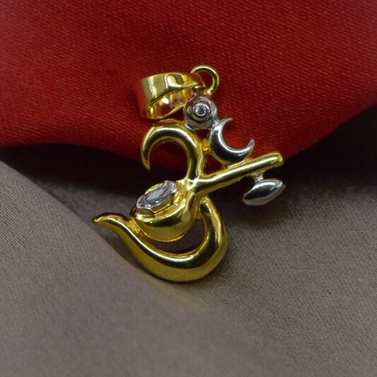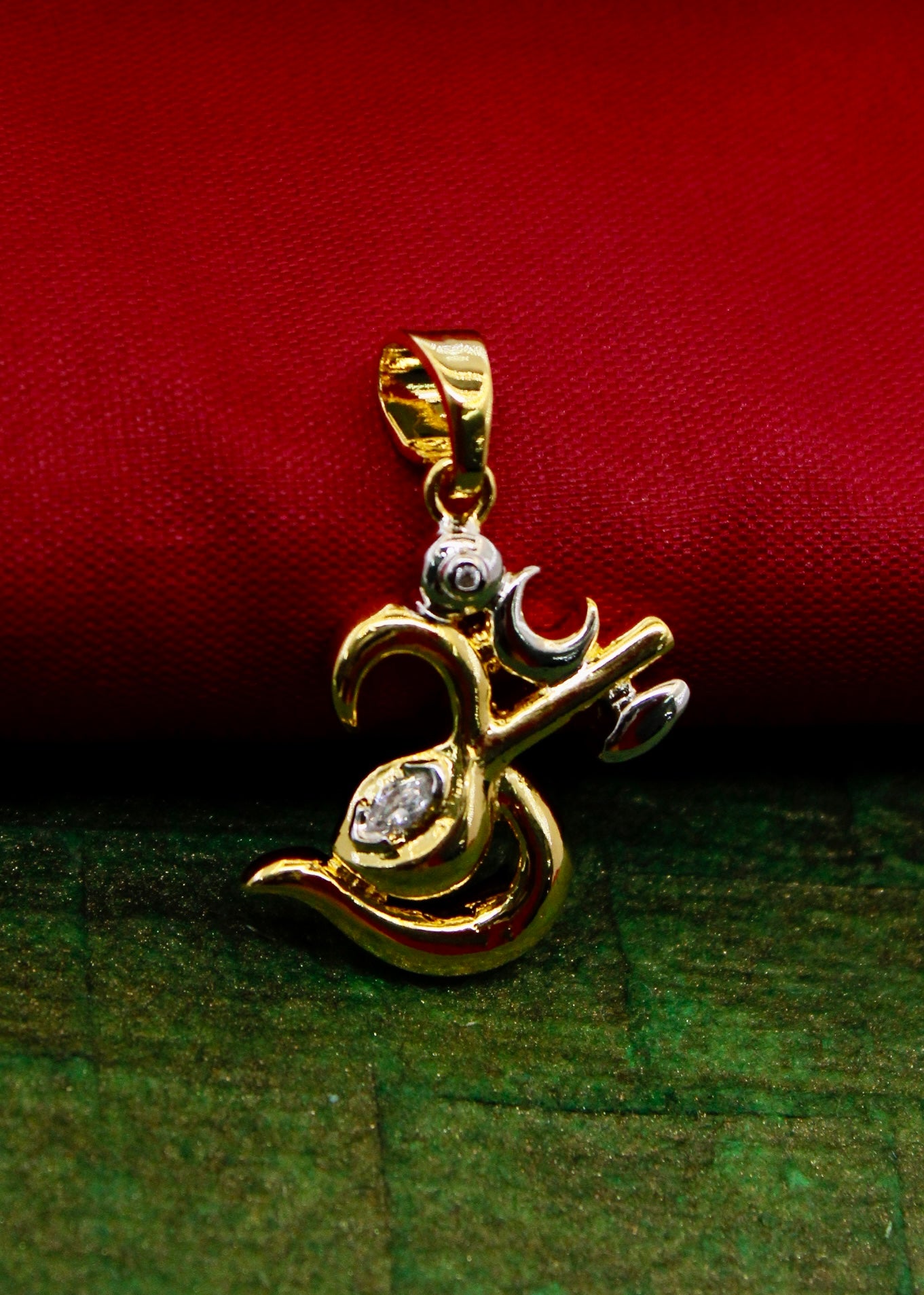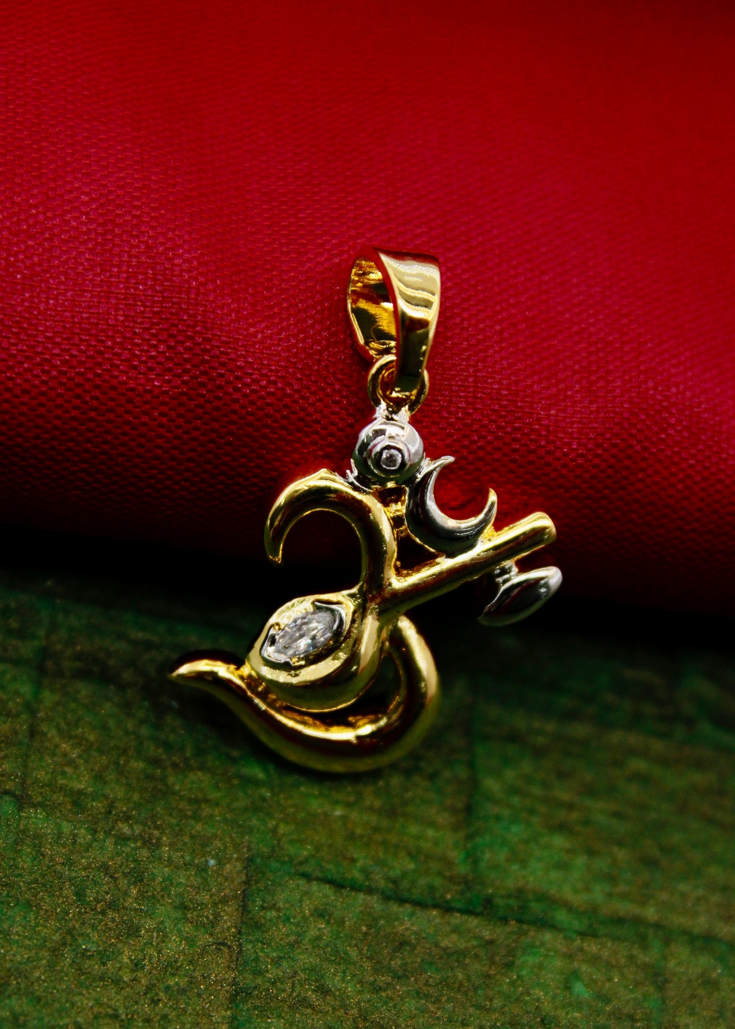 This festive season Sonchafa Jewellery brings to you this gold silver finish alluring Om designer pendant. It is inspired by Om along with studded white stone and made from gold silver finish metal. This pendant is ensure high durability.