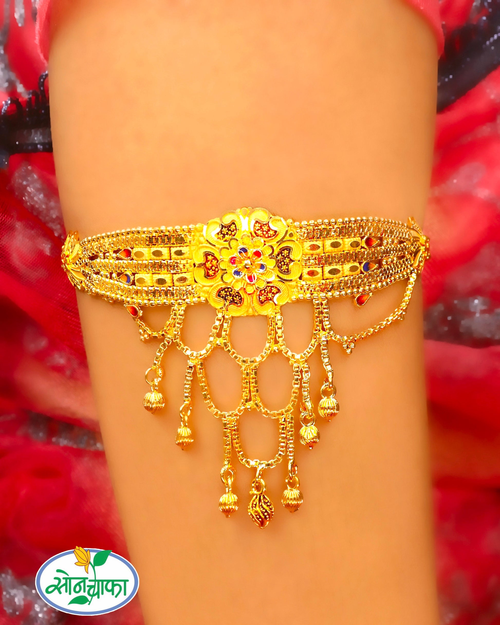 Look at this matt gold finish Waki from Sonchafa Jewellery. The pendant has peacock inspired intricate design which is decked with brown stones. The Golden beads bead at the bottom add to the charm.
