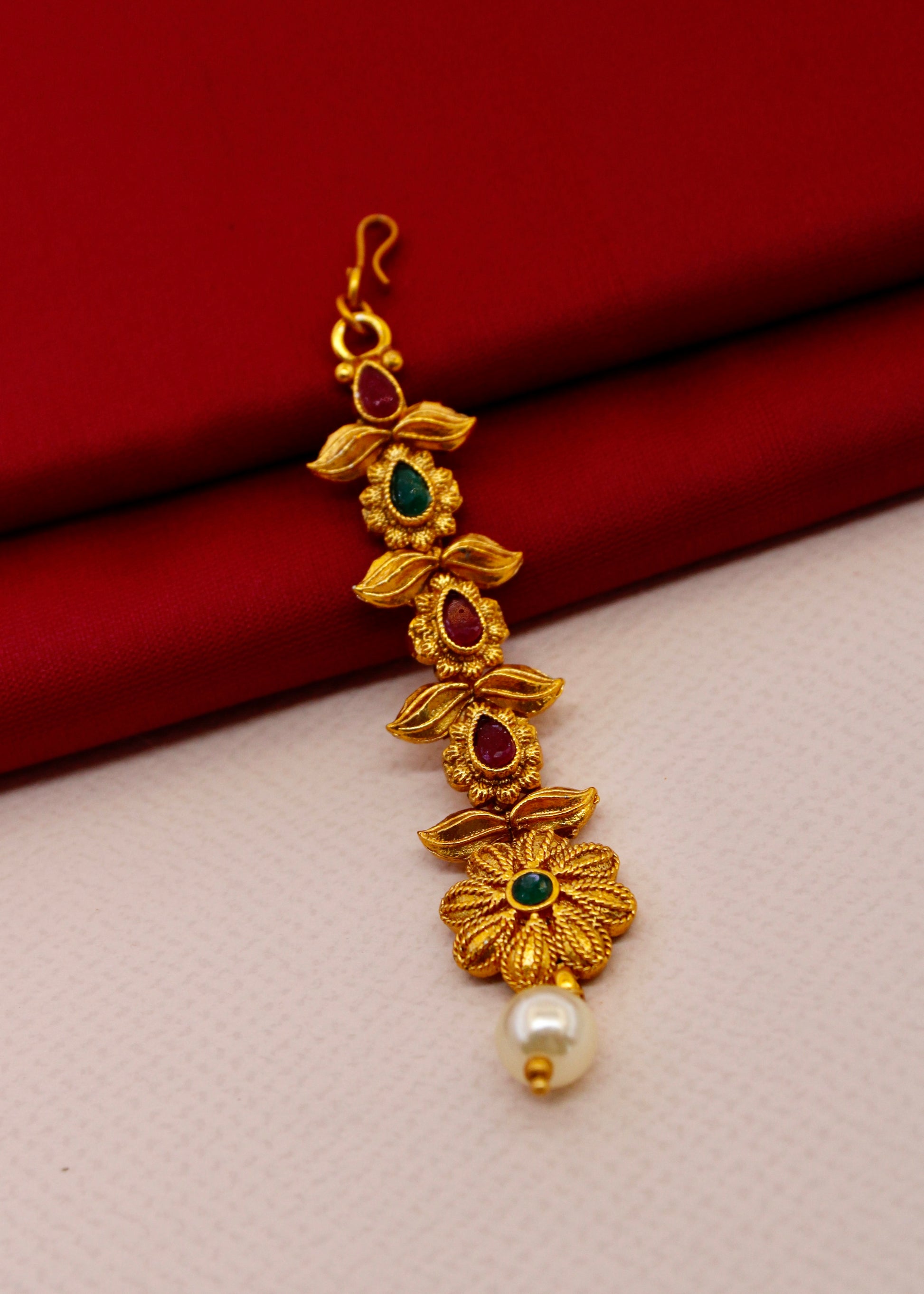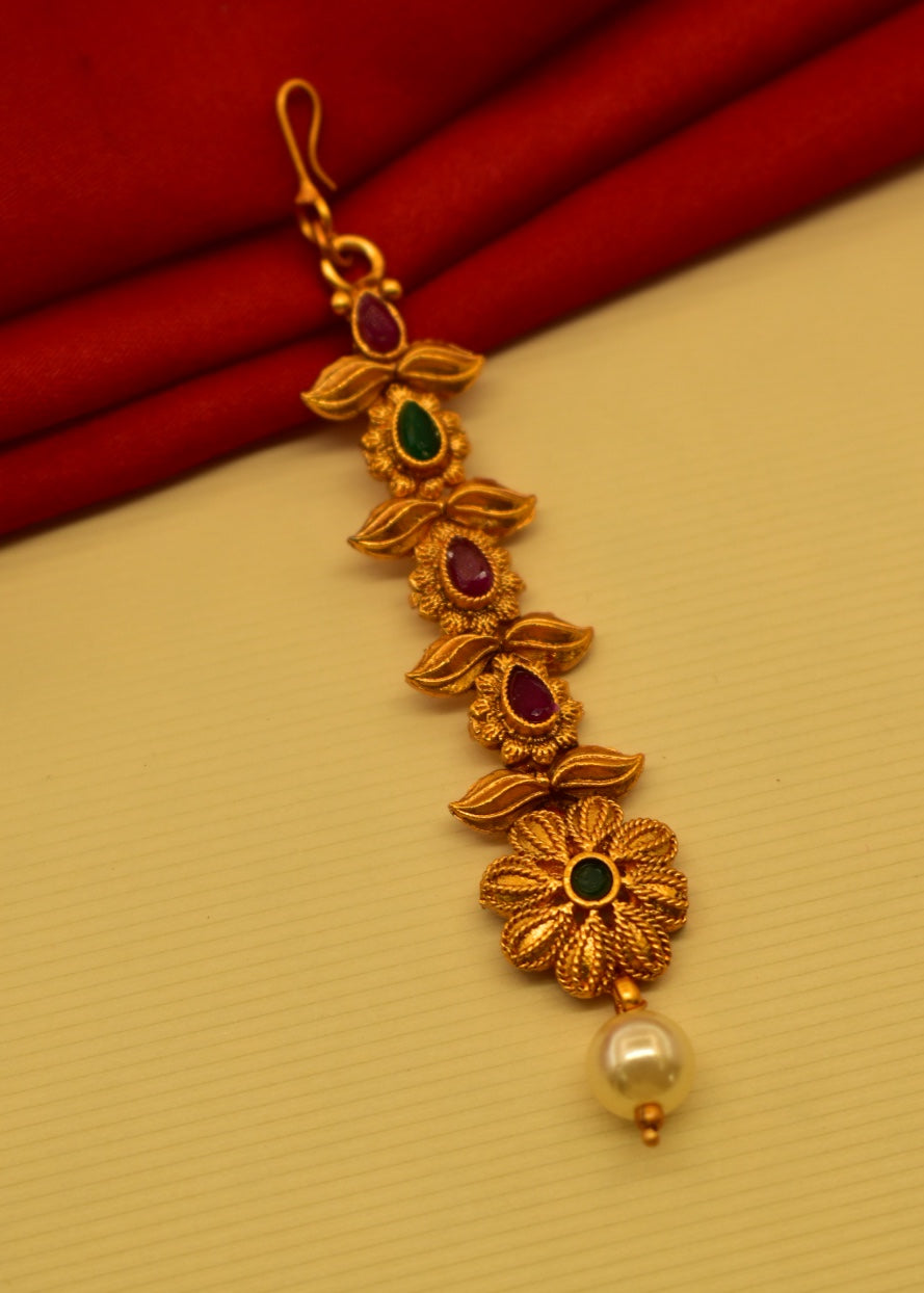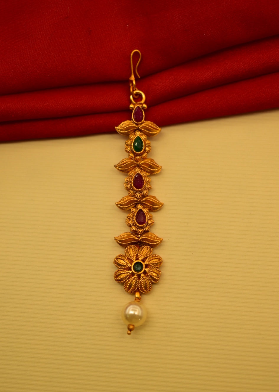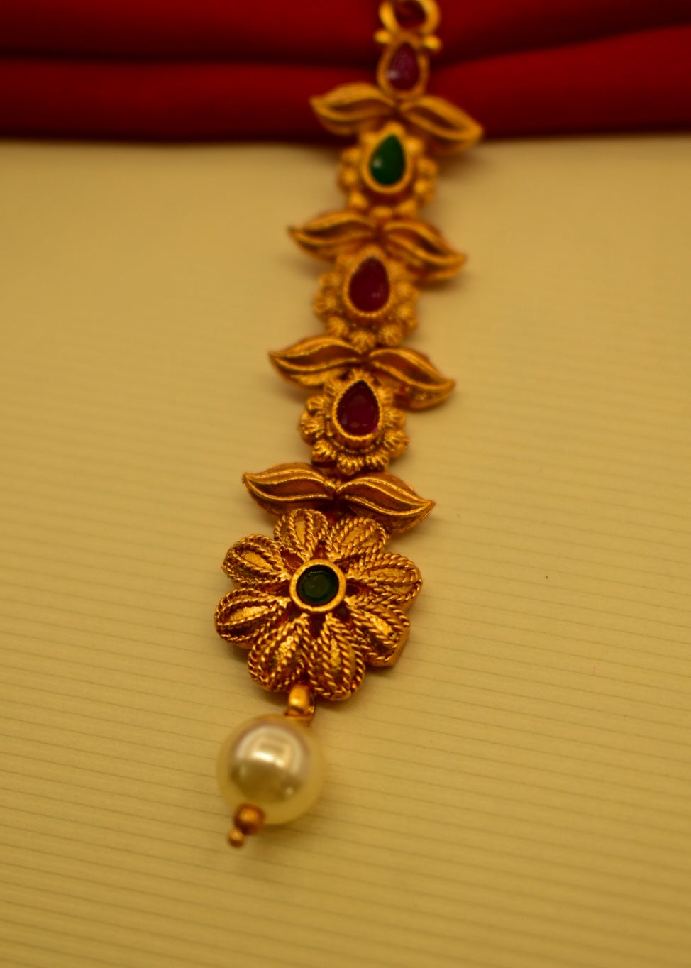 Have a look adorable classy traditional bindi from Sonchafa jewellery for stylish women like you. It is styled with studded pink, green stone along with pearls beads droplets and made from matte golden finish metal.