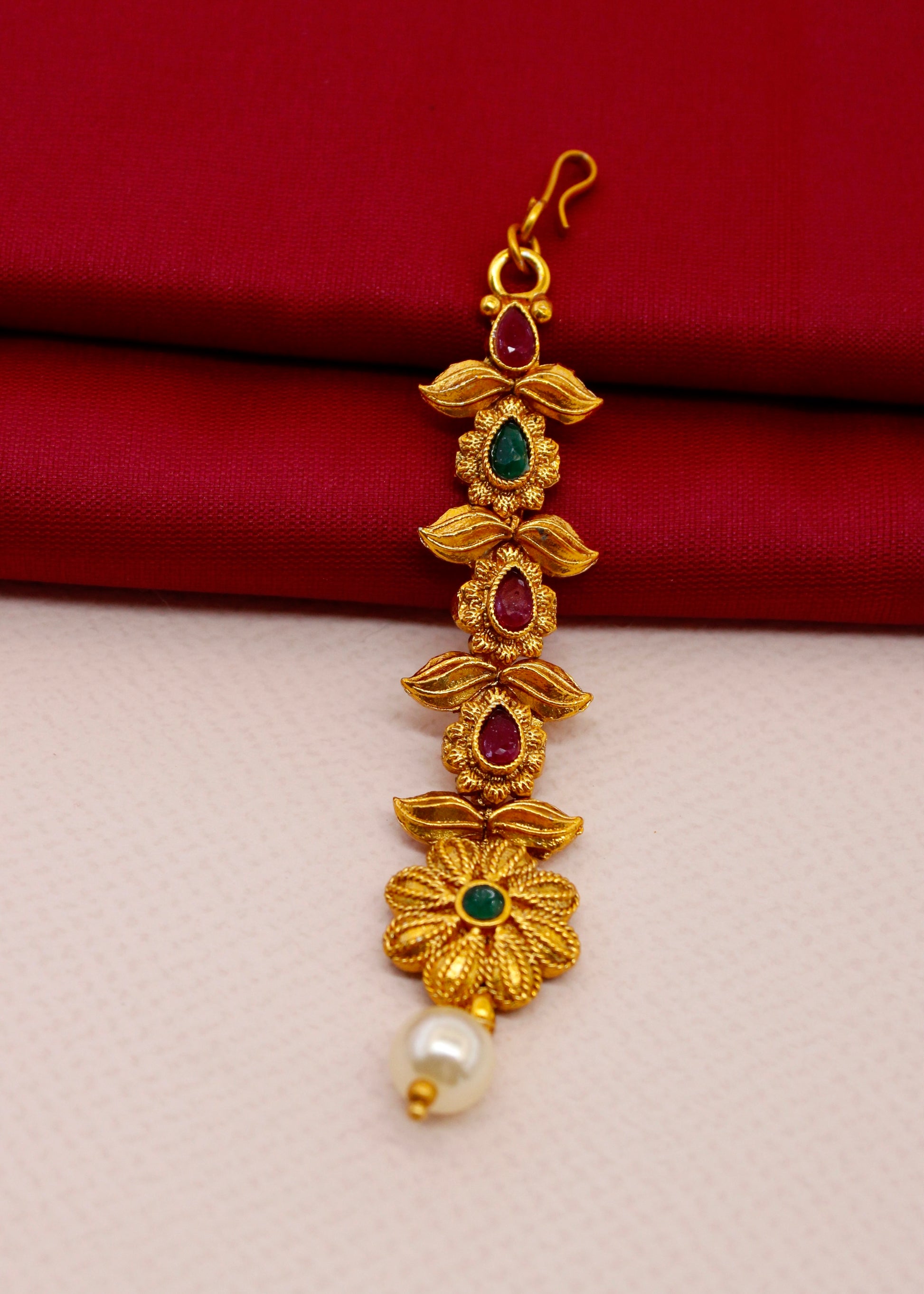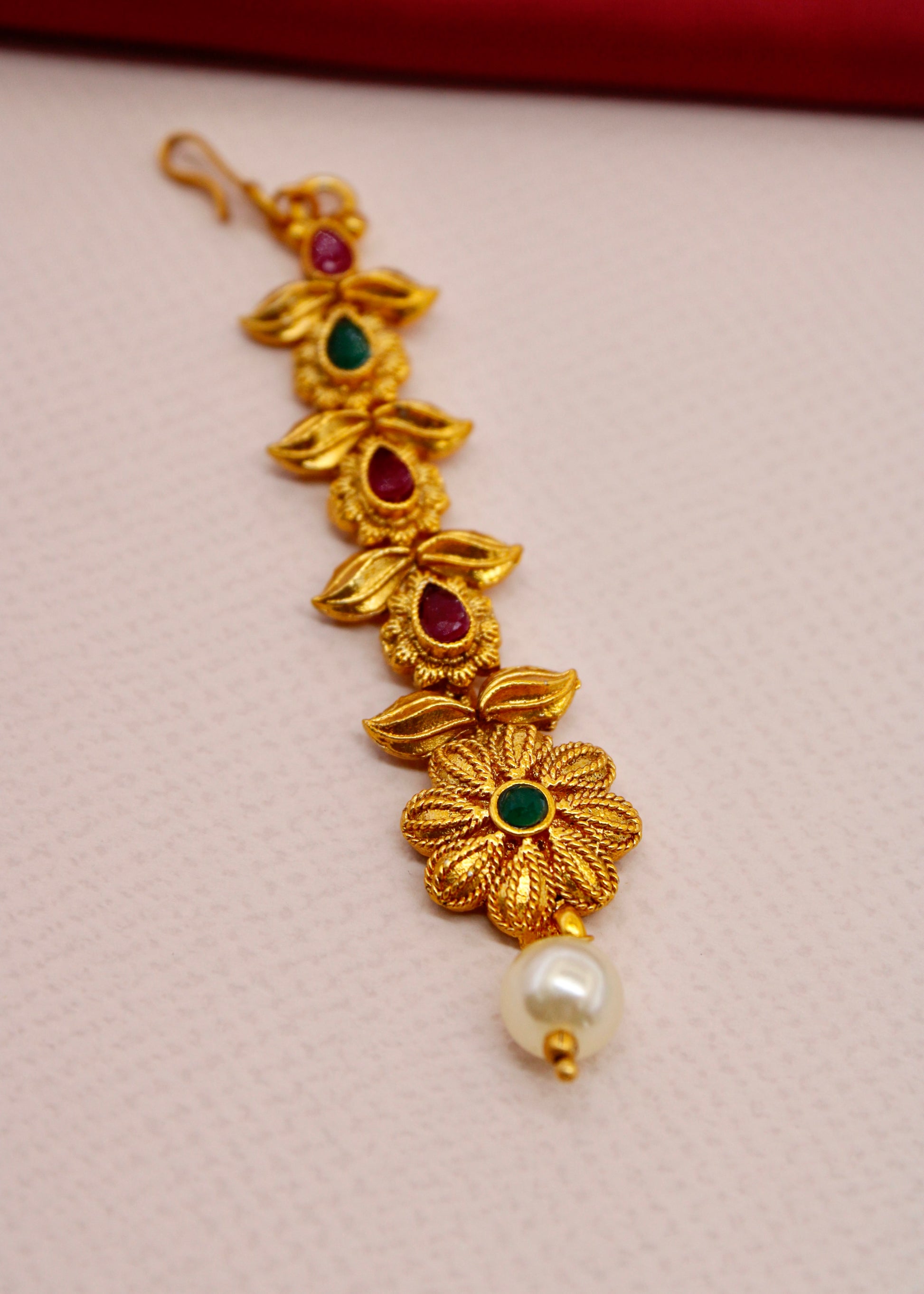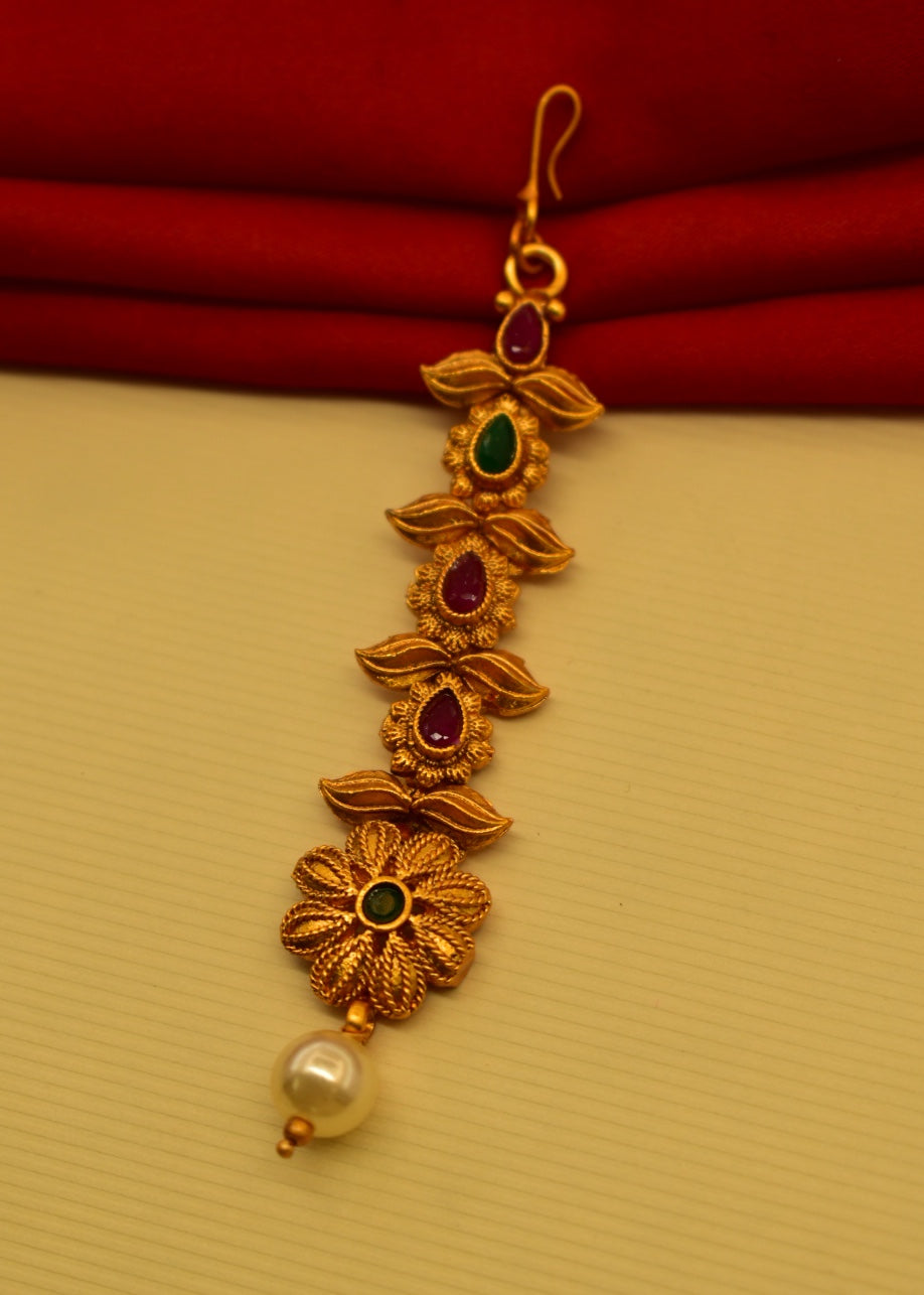 Have a look adorable classy traditional bindi from Sonchafa jewellery for stylish women like you. It is styled with studded pink, green stone along with pearls beads droplets and made from matte golden finish metal.