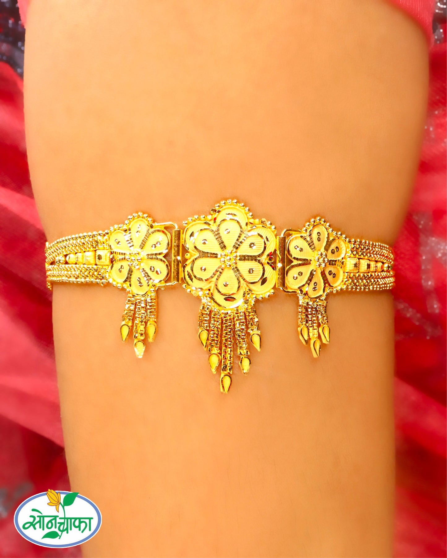 Look at this matt gold finish Waki from Sonchafa Jewellery. The pendant has peacock inspired intricate design which is decked with brown stones. The Golden beads bead at the bottom add to the charm.