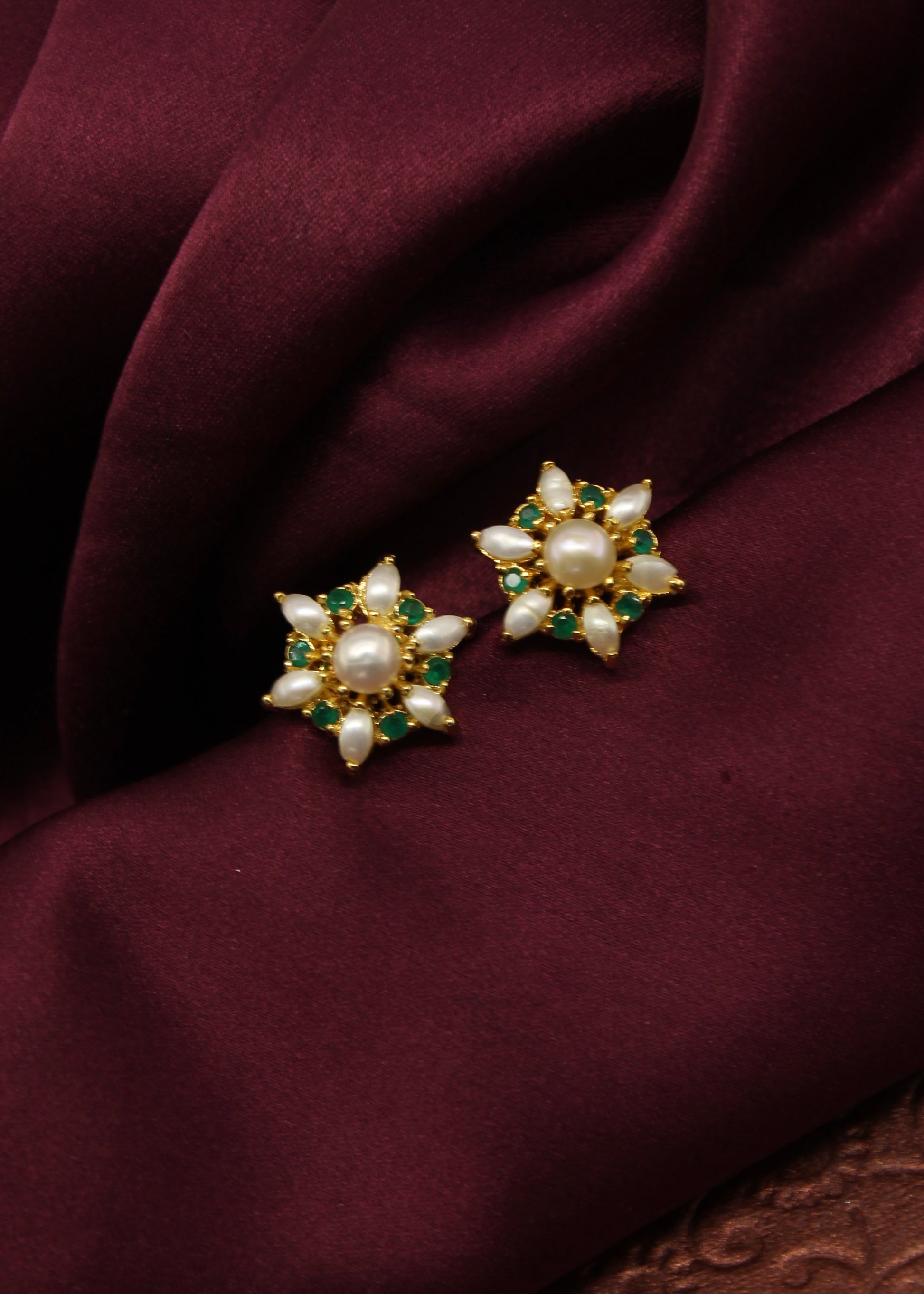 Sonchafa jewellers brings this ethnic pattern beautiful studs are highly adorable and perfect to team with traditional costumes. They are encrusted with colour stones and attractive pearl beads. These studs are fashioned from golden finish metal.