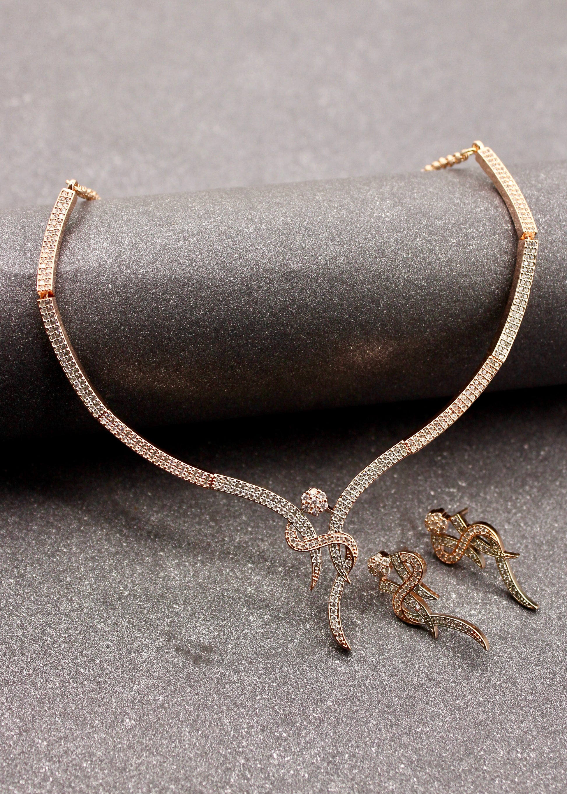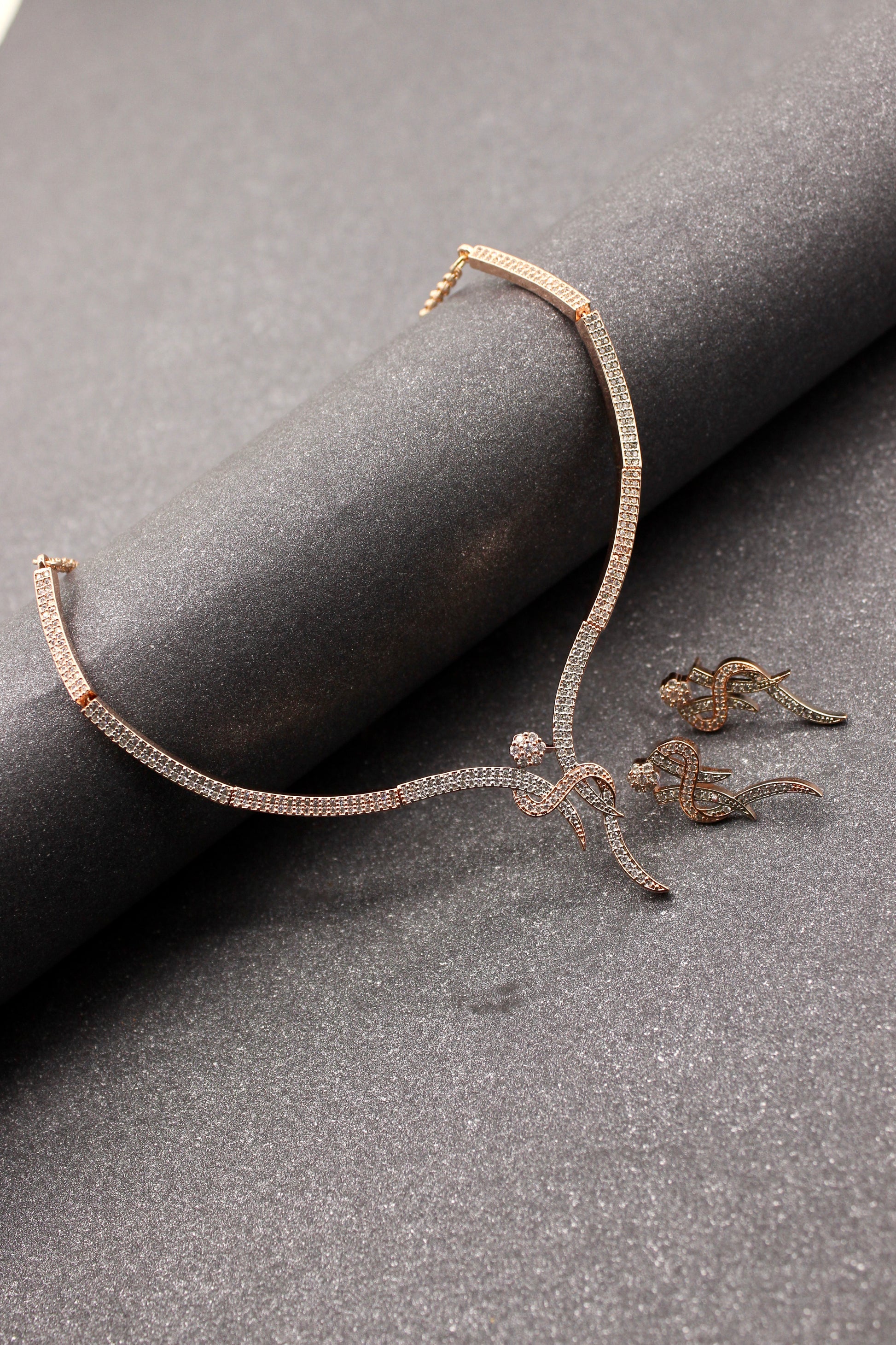 Take a look at this beautifully designed Dia necklace set from Sonchafa Jewellery. This necklace is made from high quality rose gold finish metal. This pretty necklace set has a petite floral design and stunning earrings studded with white stones. This designer necklace is sure to fetch you compliments.
