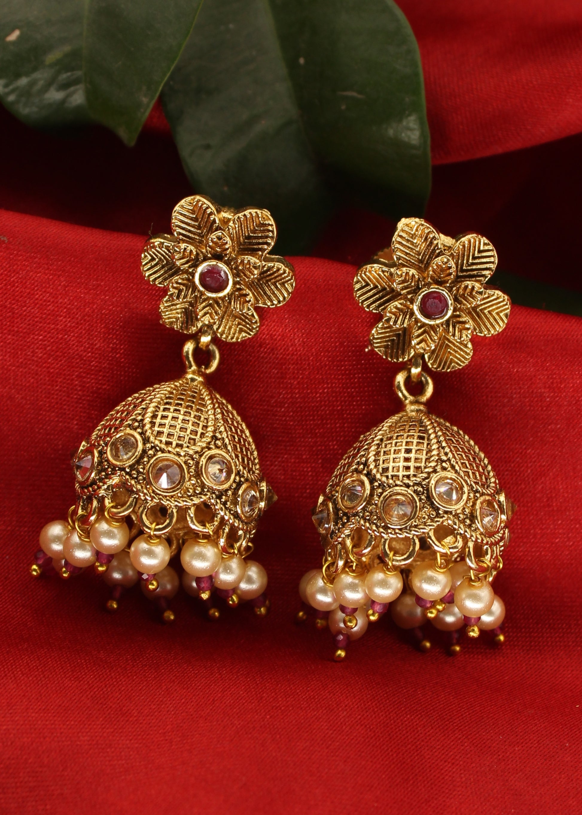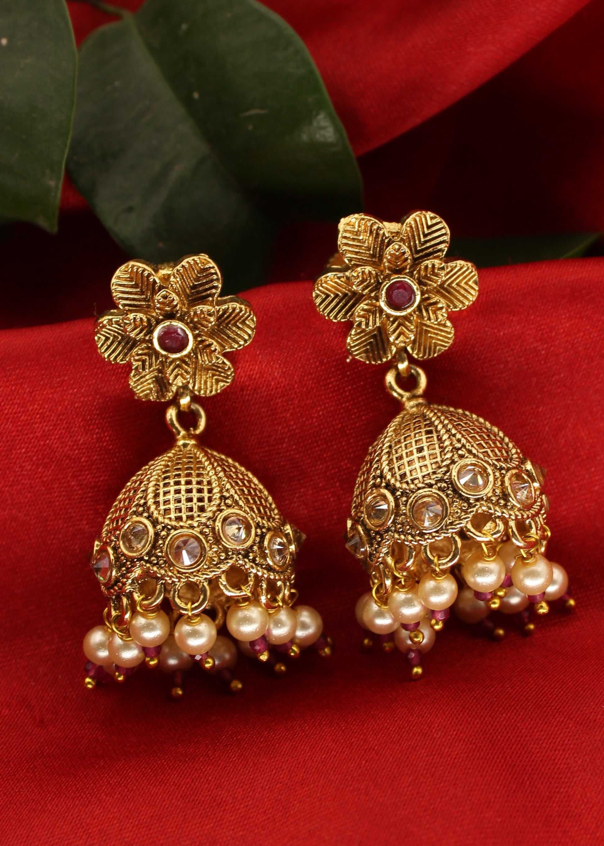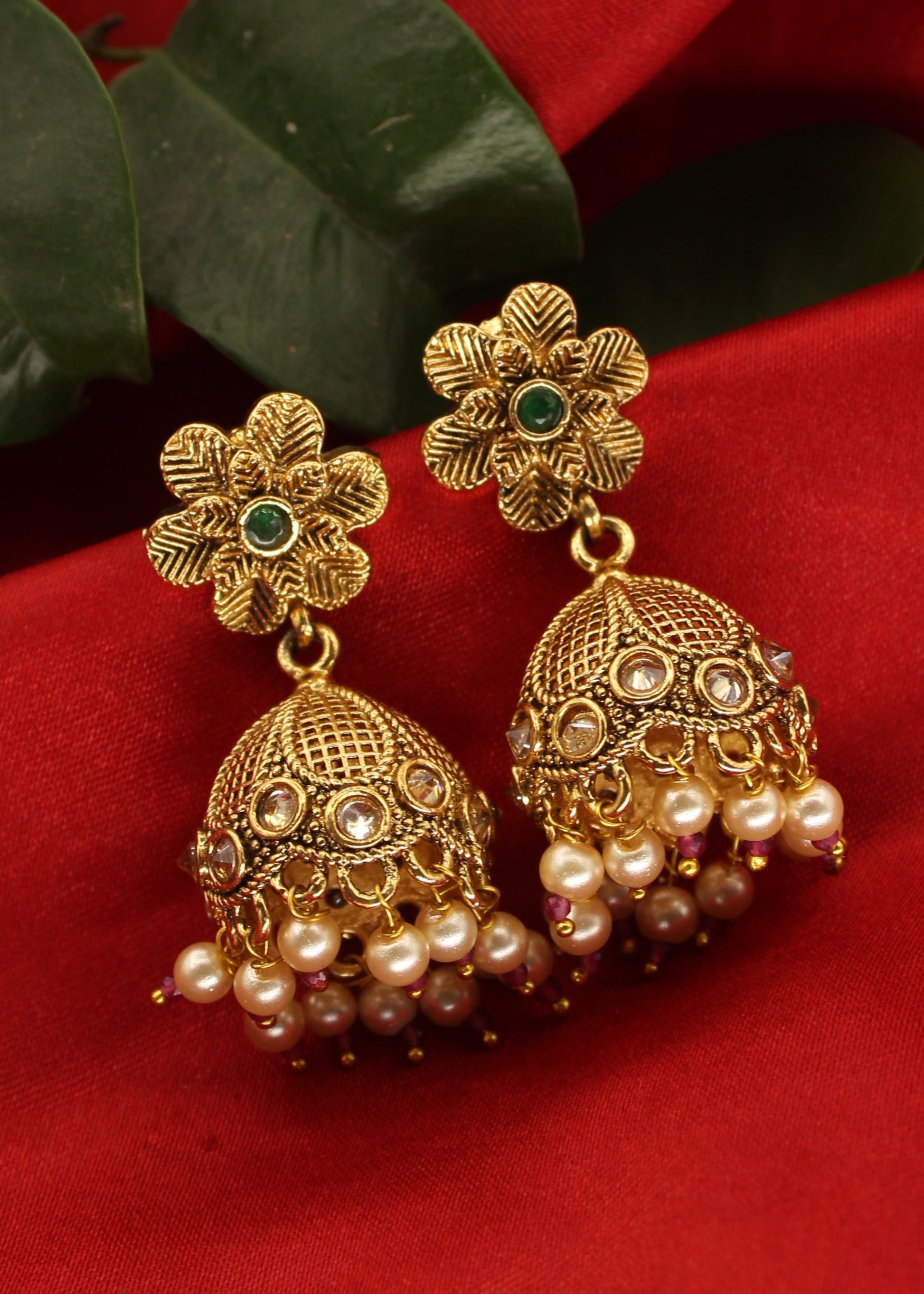 Creatively designed this pair of party wear jhumki earrings from Sonchafa Jewellery is best to team with festive costume. They are embedded with sparkling mina work and feature intricate carving design on metal surface. In addition these earrings have pearl bead droplet for added attraction.