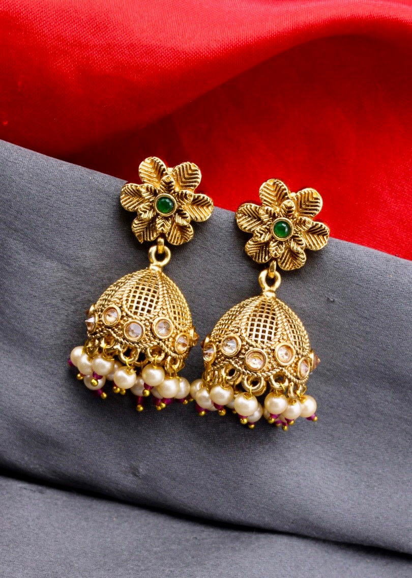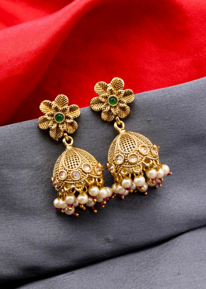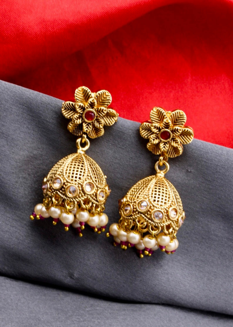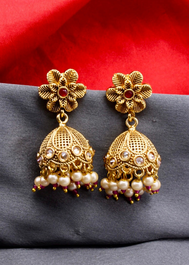 Creatively designed this pair of party wear jhumki earrings from Sonchafa Jewellery is best to team with festive costume. They are embedded with sparkling mina work and feature intricate carving design on metal surface. In addition these earrings have pearl bead droplet for added attraction.