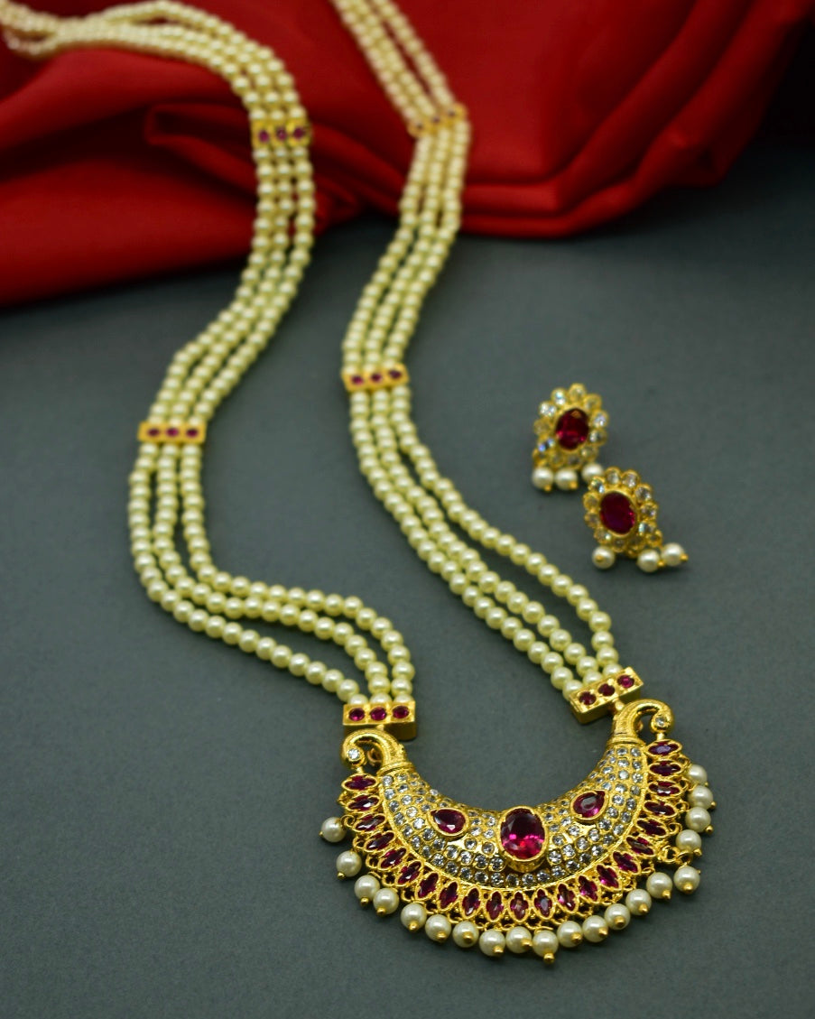 Adorn your neckline with this golden finish necklace set with your traditional costume. It is styled with studded pink-white stone along with pearl beads droplet and made from golden finish metal. This appealing necklace set is good in quality.