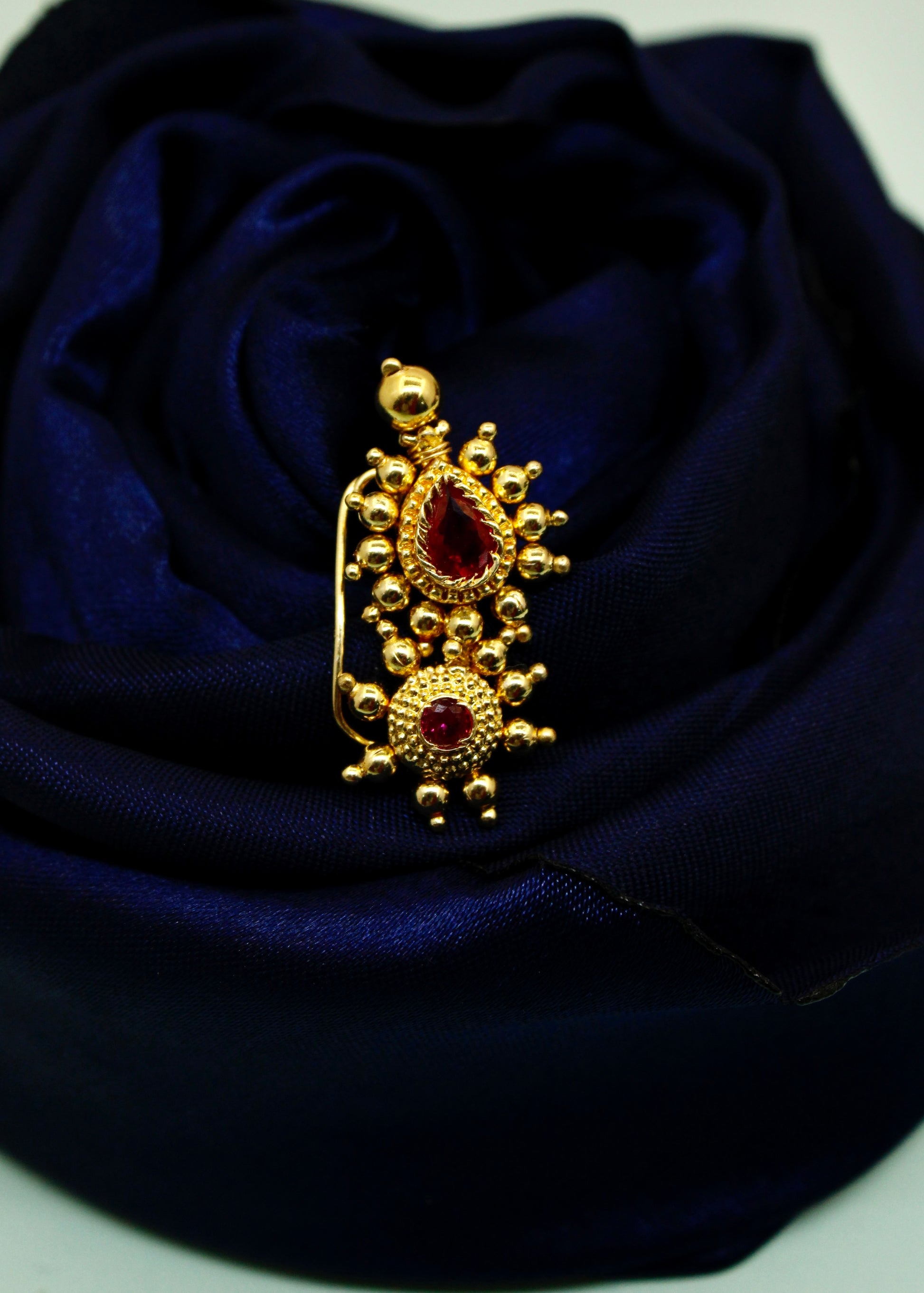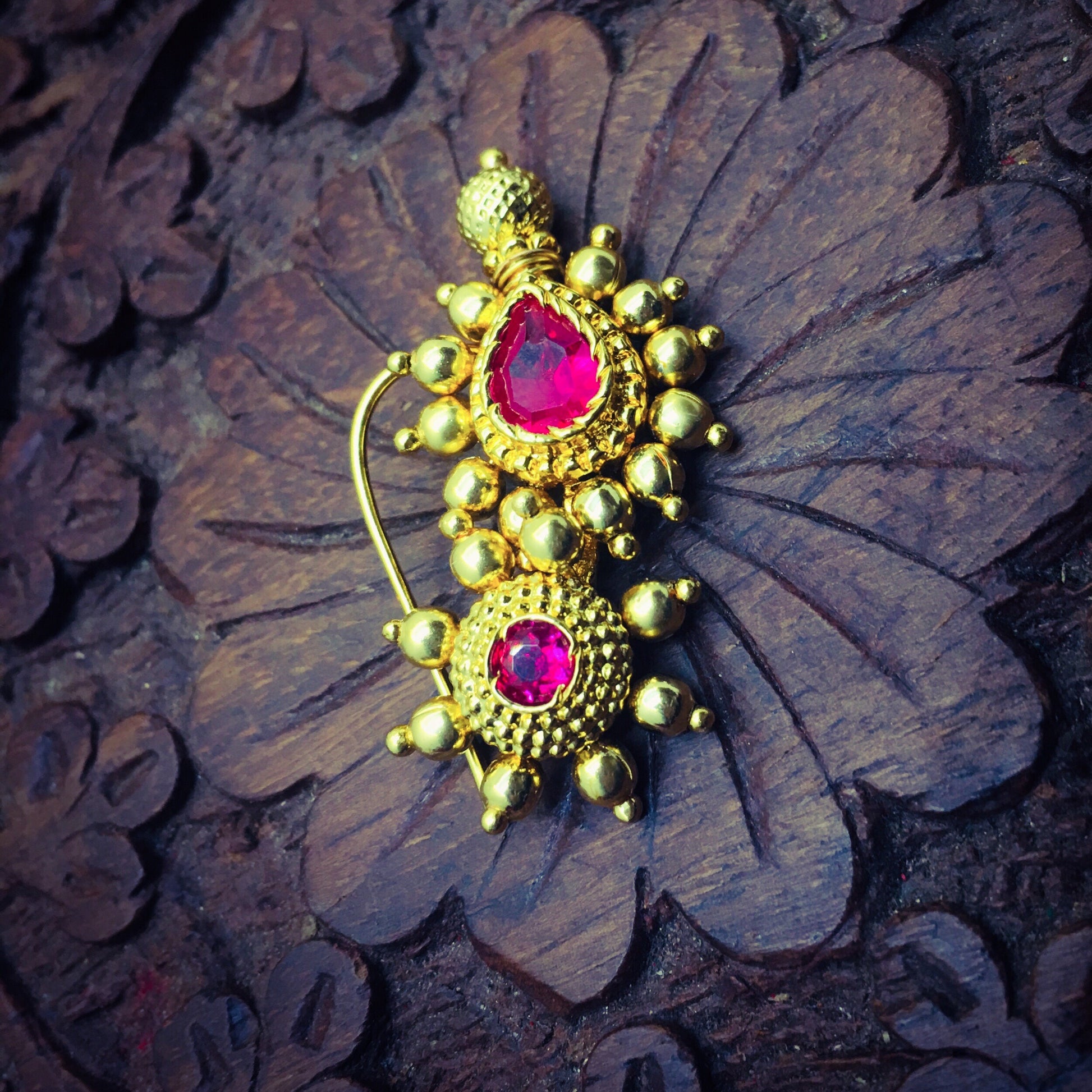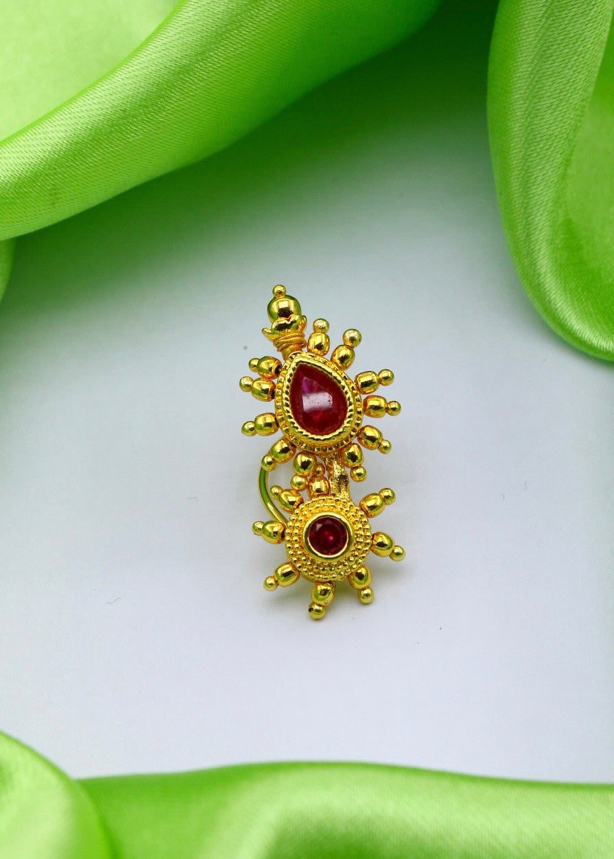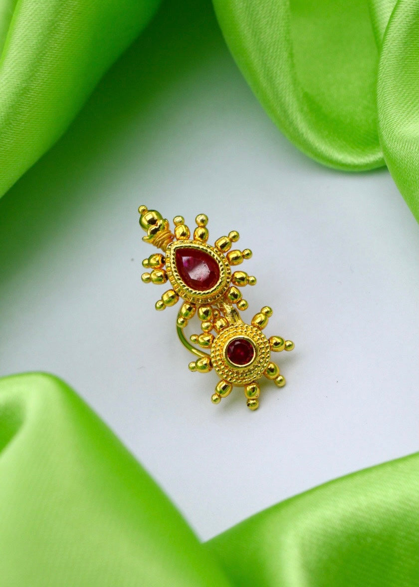 Simple & Stylish adorable Maharashtrian Nath from Sonchafa jewellery it is perfect suitable for saree or traditional outfits. It is styled with studded pink stone and made from golden finish metal. This nath is woven with good quality golden beads & easy to wear nath.