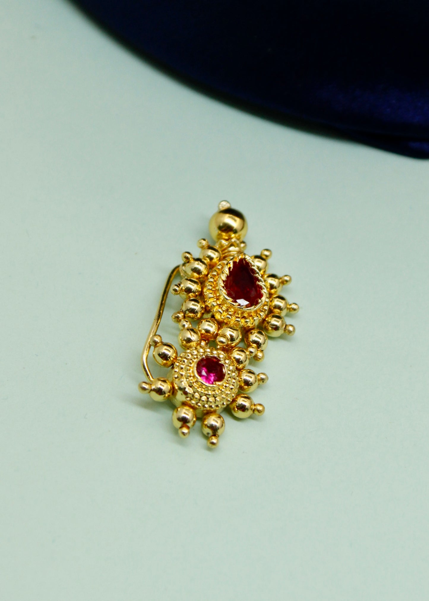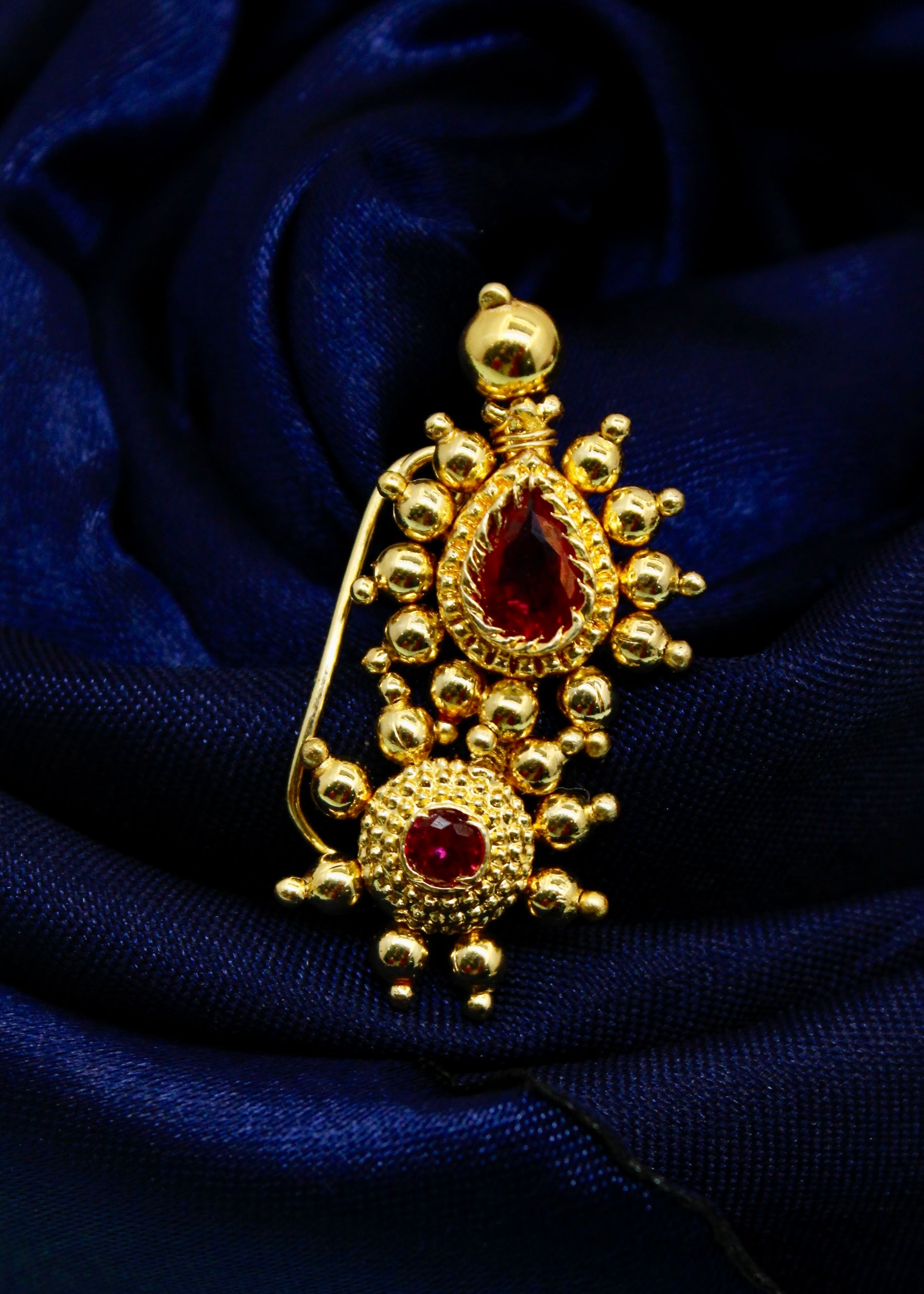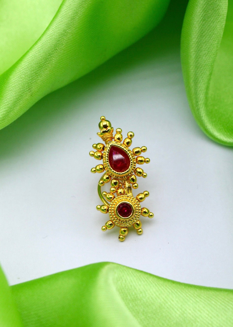 Simple & Stylish adorable Maharashtrian Nath from Sonchafa jewellery it is perfect suitable for saree or traditional outfits. It is styled with studded pink stone and made from golden finish metal. This nath is woven with good quality golden beads & easy to wear nath.