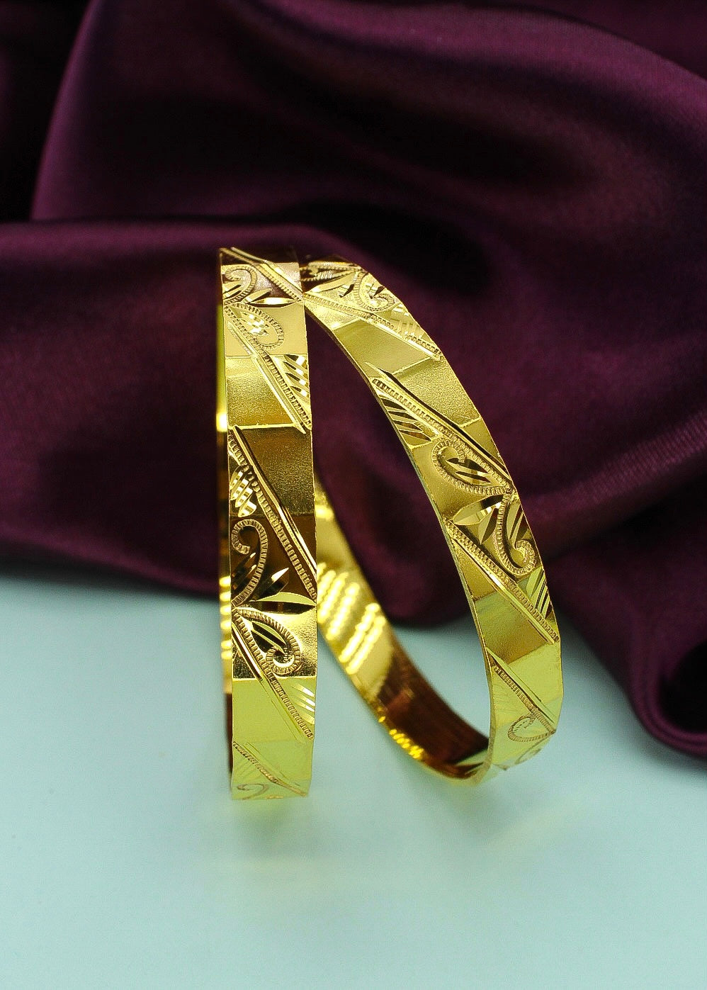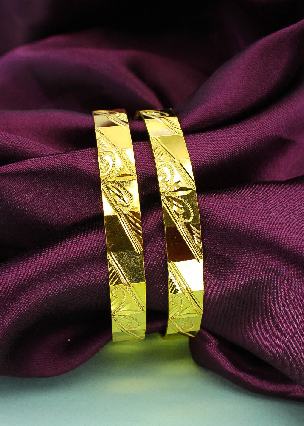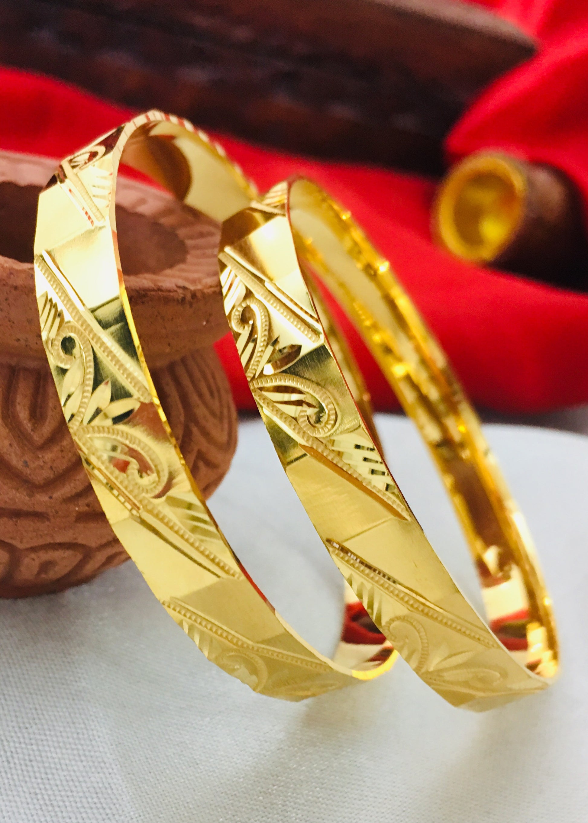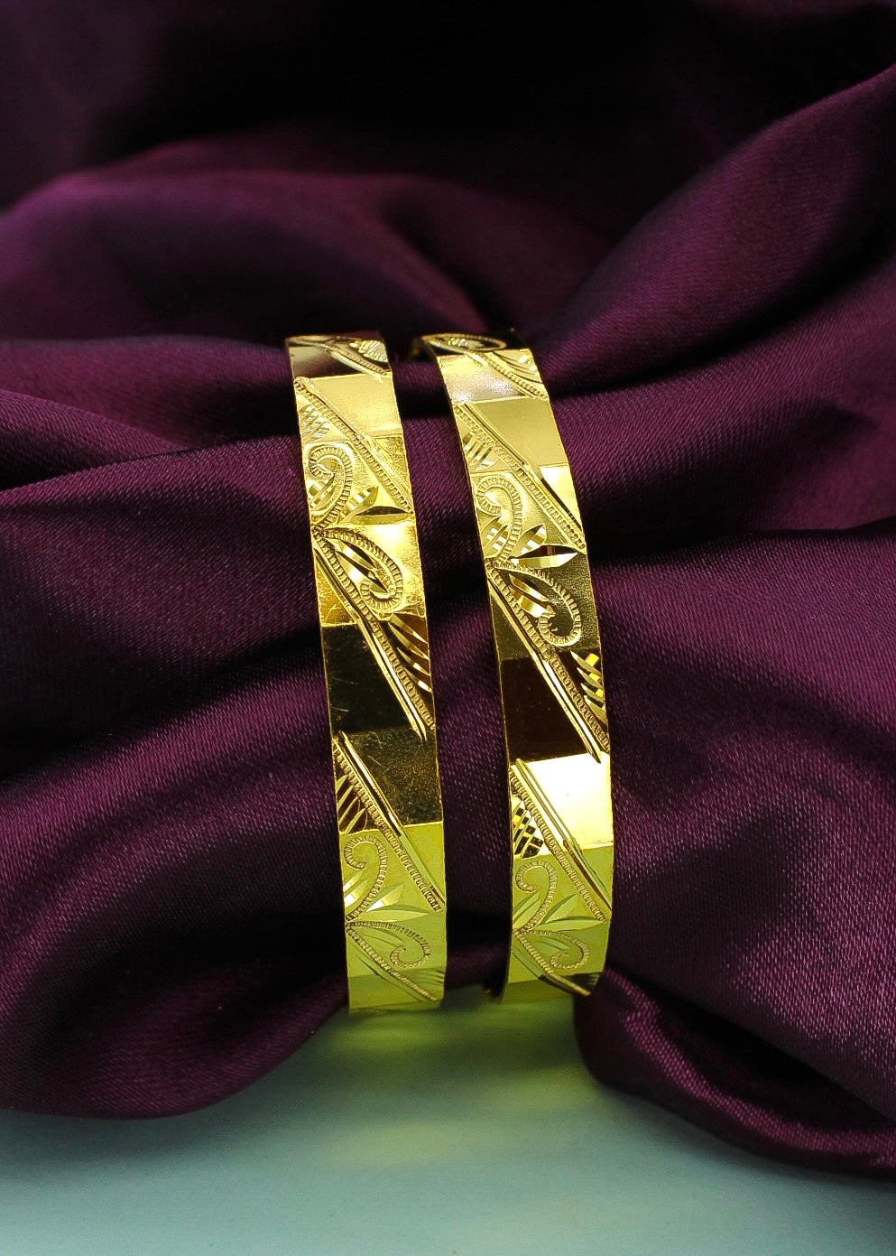 If you wish to get that perfect maharashtrian look then you must pick this pair of pailu patli 1 gram gold plated appealing bangles from Sonchafa Jewellery. They feature wonderful intricate carving design and made from golden finish metal.