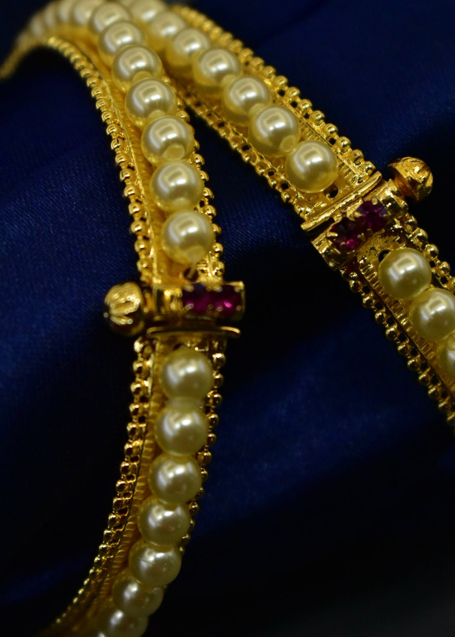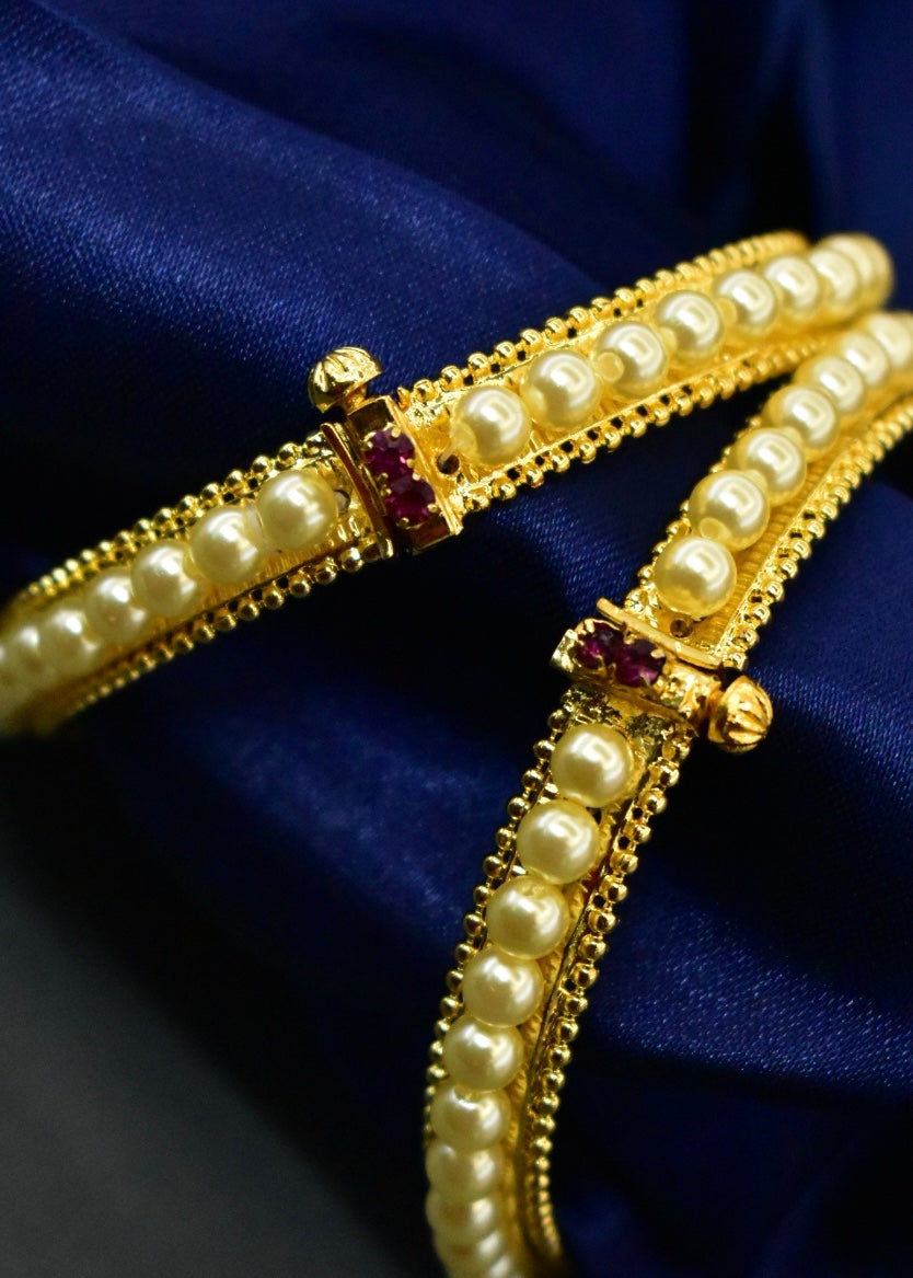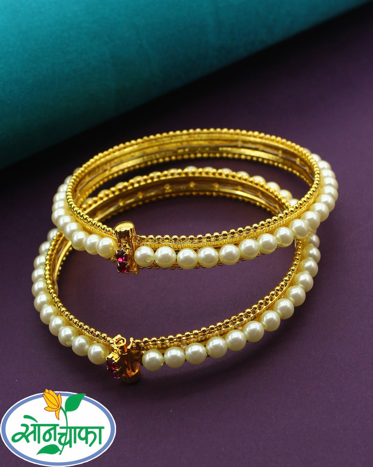 Make a unique addition to your accessory collection by adding this appealing pair of moti bangles from Sonchafa Jewellery. These are embedded with sparkling pink stones and wonderfully woven with attractive moti. These bangles are made from golden finish metal and ensures high durability.