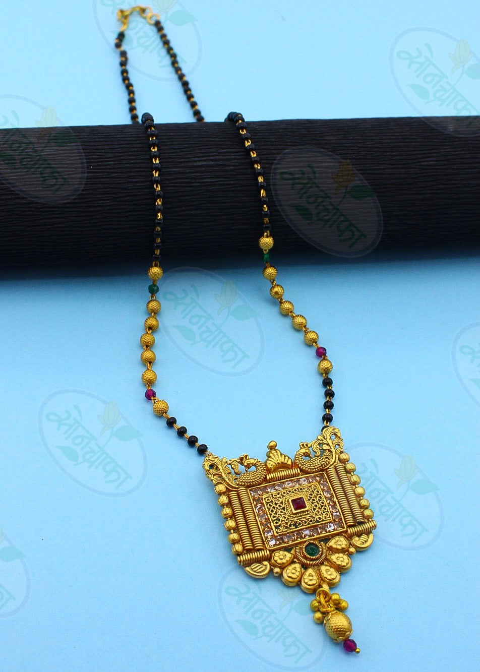 A very beautiful Rajwadi mangalsutra from Sonchafa Jewellery will appeal to you at very first look. It is studded with pink, green, white stone and fashioned from antique gold finish metal along with it is woven with black, golden beads in single layer chain. You can wear this pretty mangalsutra with any of your casual outfits.